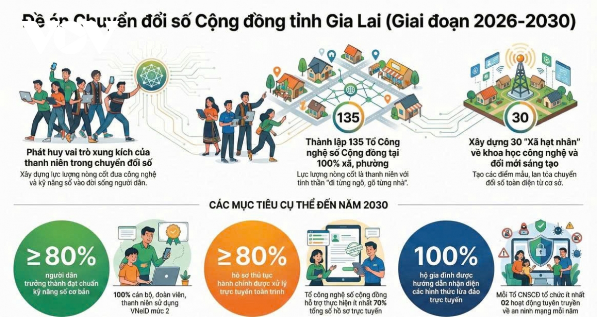 VOV.VN - UBND tỉnh Gia Lai vừa ban hành Quyết định phê duyệt Đề án “Phát huy vai trò của đoàn viên, thanh niên trong chuyển đổi số cộng đồng giai đoạn 2026–2030”, với mục tiêu đưa kỹ năng và tiện ích số đến gần người dân, doanh nghiệp ngay từ cơ sở.