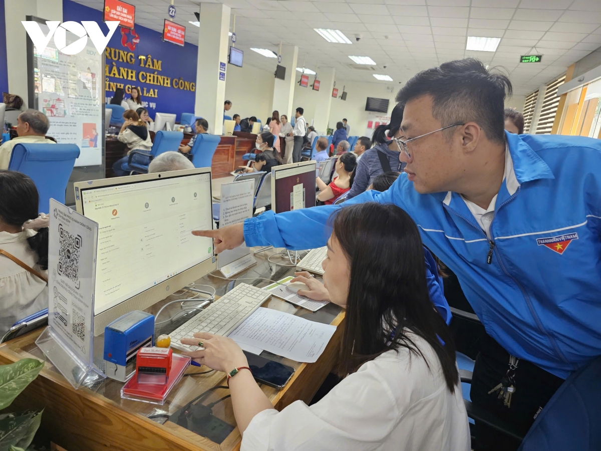 Đoàn viên, thanh niên tỉnh Gia Lai hỗ trợ, hướng dẫn người dân nộp hồ sơ thủ tục hành chính.