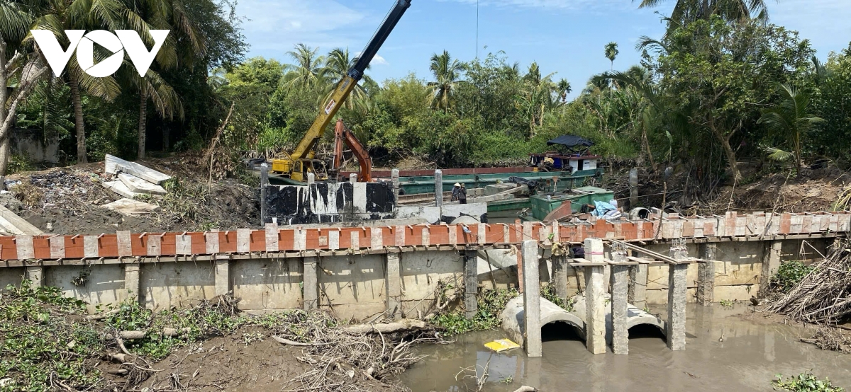 Công trình cống cầu Sơn, xã Hòa Nghĩa, huyện Chợ Lách đang thi công khẩn trương để ngăn mặn