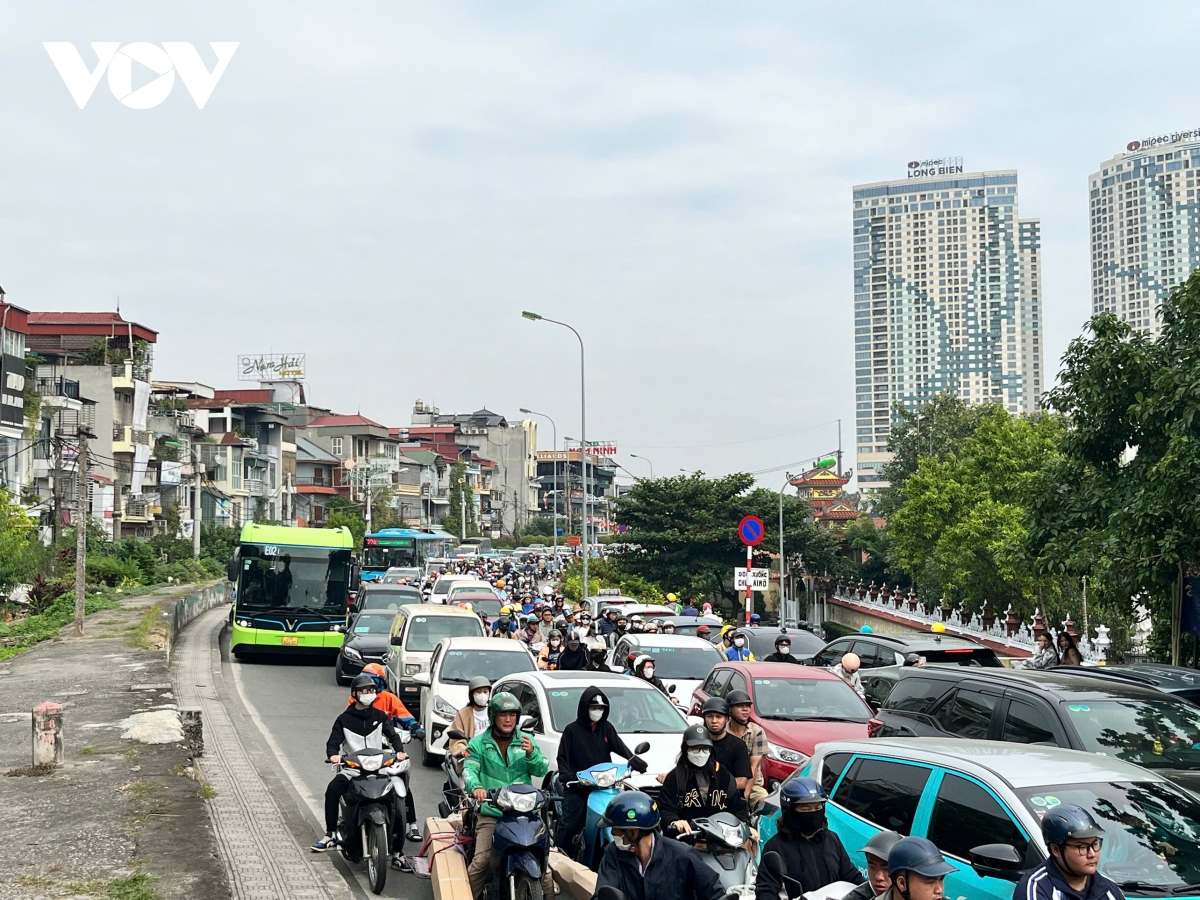 Toàn bộ phương tiện và người tham gia giao thông phải đi đường vòng sang cầu Chương Dương khiến giao thông ùn tắc kéo dài....