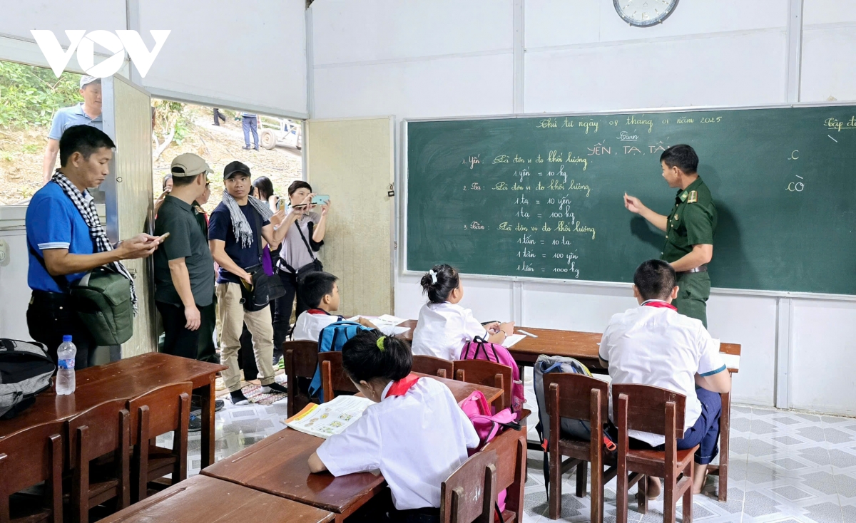 Các đại biểu mới đến Hòn Chuối dễ ấn tượng với lớp học tình thương do lực lượng Biên phòng duy trì nhiều năm nay. Lớp học đặc biệt bởi, chỉ có 1 lớp, 1 người thầy nhưng đang dạy học sinh từ lớp 1 đến lớp 5