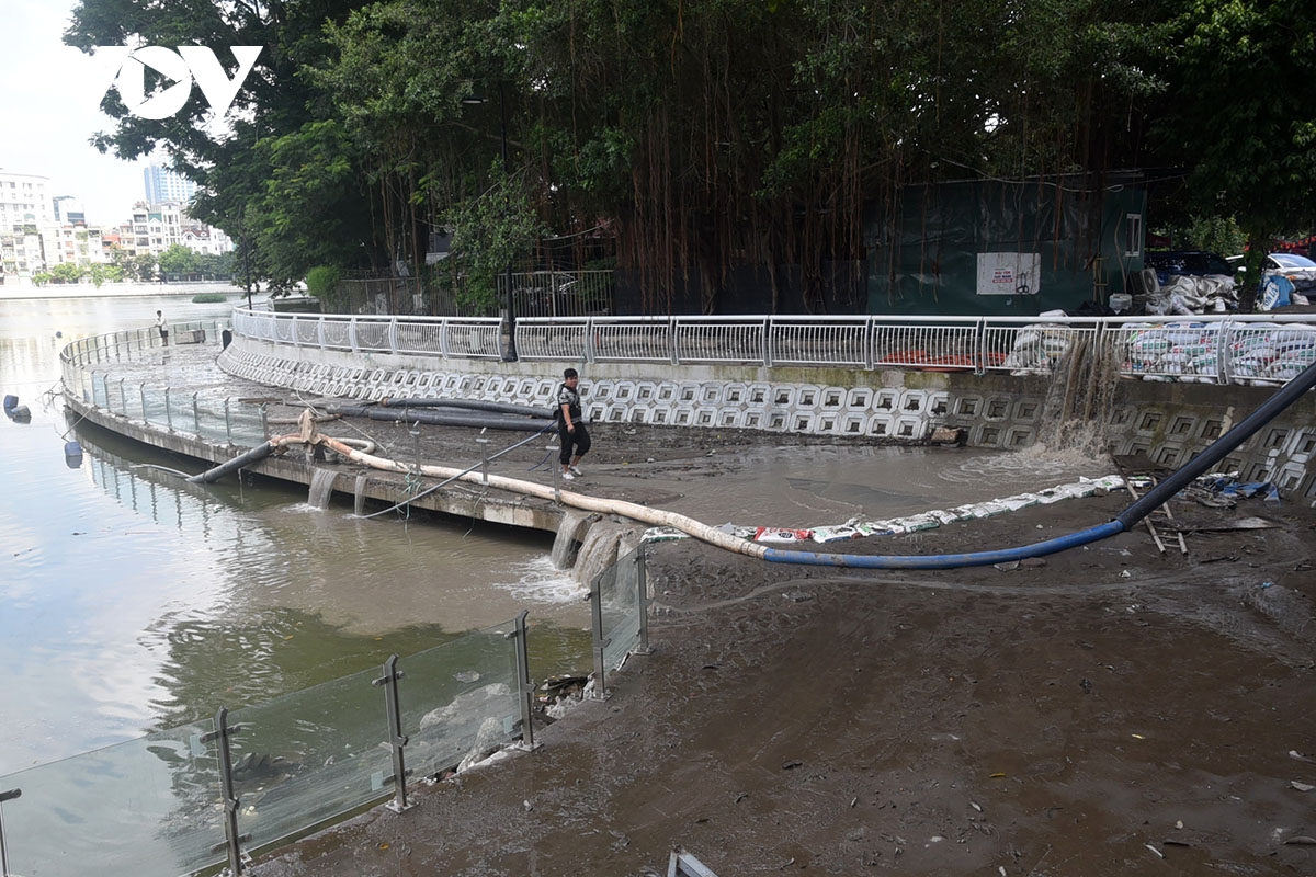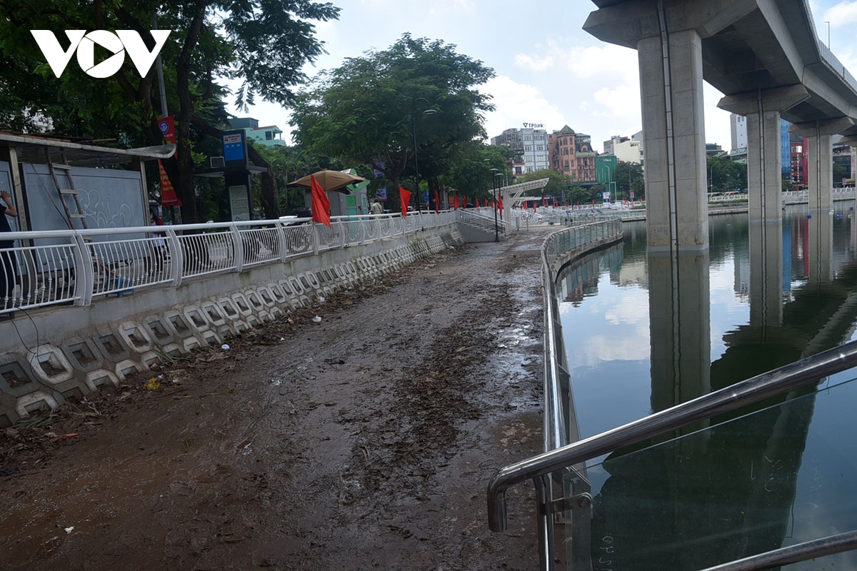 Lối đi dạo bờ hồ đoạn Hoàng Cầu bê bết bùn đất sau khi nước rút đi.