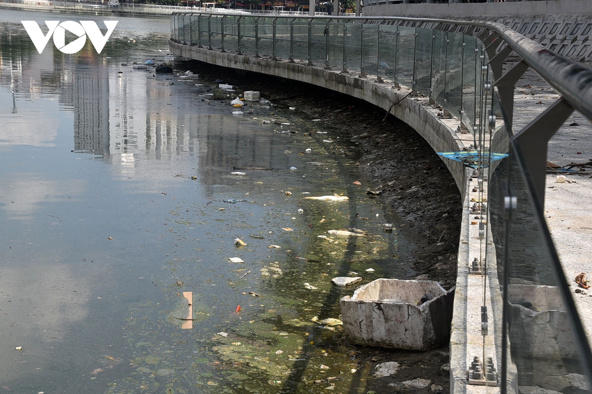 Lối đi dạo quanh hồ đoạn phố Đặng Tiến Đông đầy xác cá chết thối