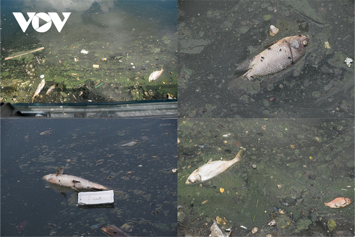 Dưới hồ xác cá chết ngộp nổi lập lờ.