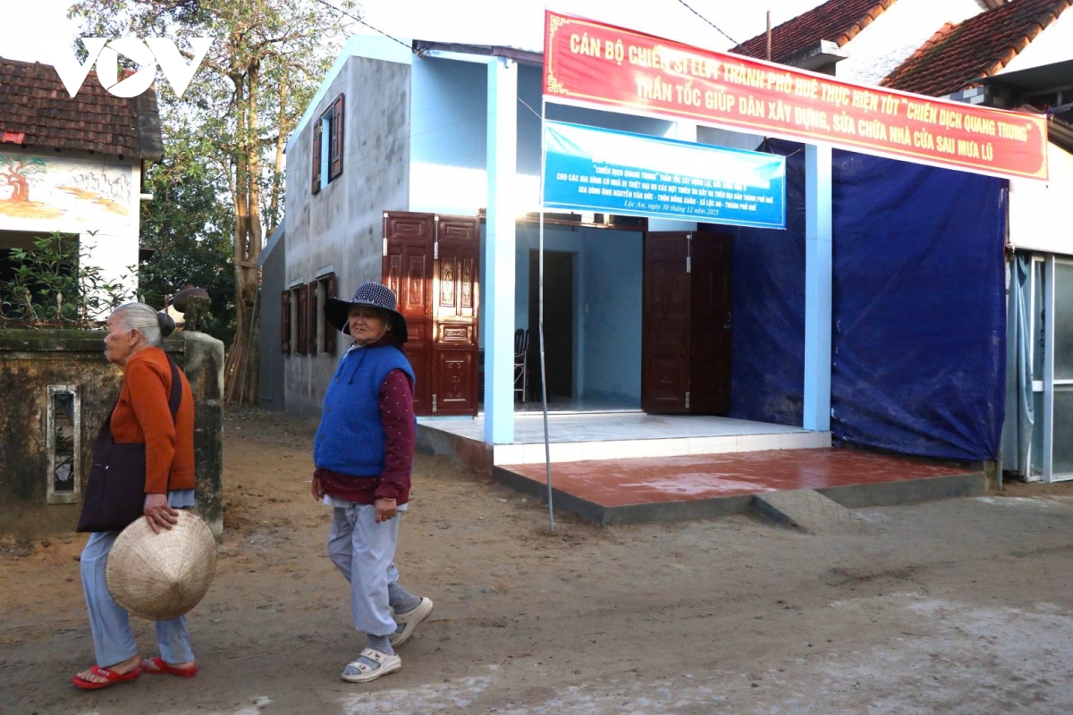 VOV.VN - Chỉ sau hơn một tháng thi công liên tục, vượt qua trở ngại mưa gió, rét đậm kéo dài, 5 ngôi nhà mới đã kịp hoàn thành tặng các hộ dân bị sập nhà do mưa lũ tại 2 xã Khe Tre và Lộc An; đồng thời 40 ngôi nhà bị hư hỏng trên địa bàn thành phố Huế cũng đã sửa chữa hoàn thiện giúp người dân.