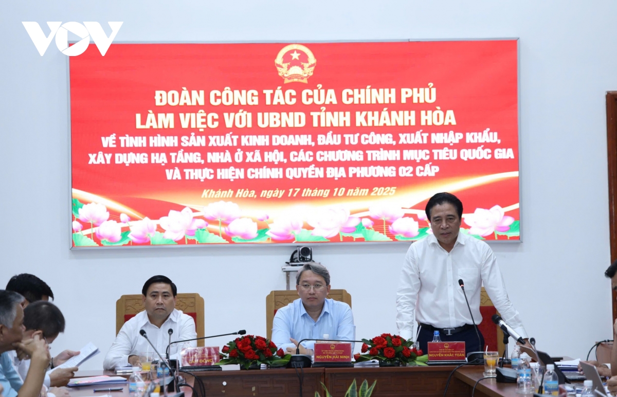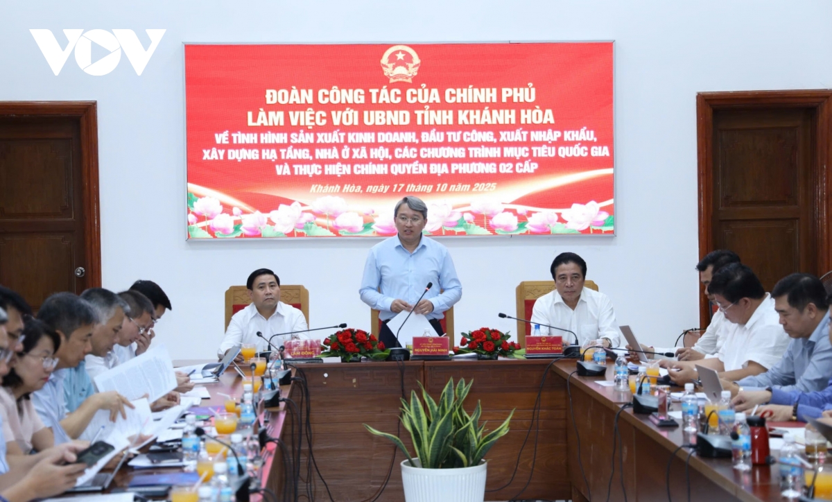 Chiều 17/10, Đoàn công tác của Chính phủ do ông Nguyễn Hải Ninh, Ủy viên Trung ương Đảng, Bộ trưởng Bộ Tư pháp làm trưởng đoàn đã làm việc với UBND tỉnh Khánh Hòa về tình hình sản xuất kinh doanh, đầu tư công, xuất nhập khẩu, phát triển hạ tầng, nhà ở xã hội, các chương trình mục tiêu quốc gia và việc triển khai mô hình chính quyền địa phương hai cấp.