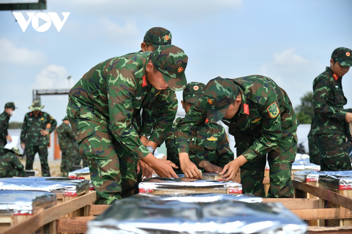 Cán bộ, chiến sĩ bên những thùng pháo.