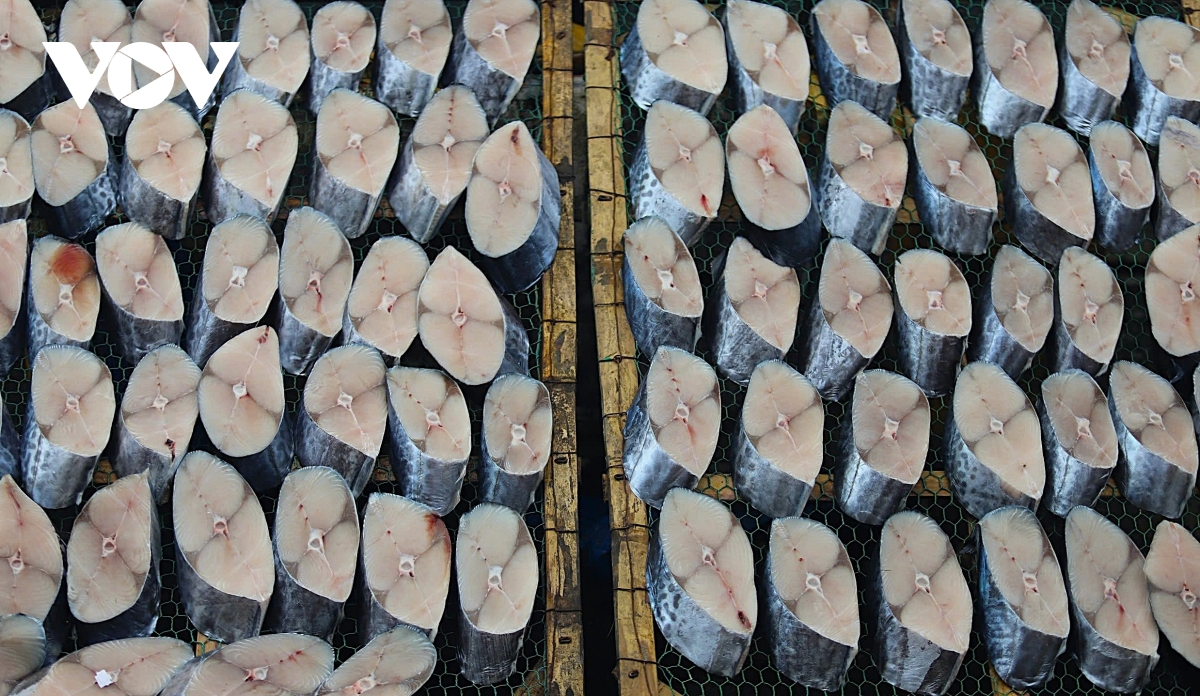 Sau khi cắt miếng chuẩn chỉ, cá được sơ chế rồi phơi lên giàn sắt để ráo nước, se thịt trước khi thực hiện công đoạn tiếp theo. Cá nướng ở nơi đây thì cá thu chiếm phần lớn, sau đó là cá thửng và các loại,…(Ảnh: Hải Chi).