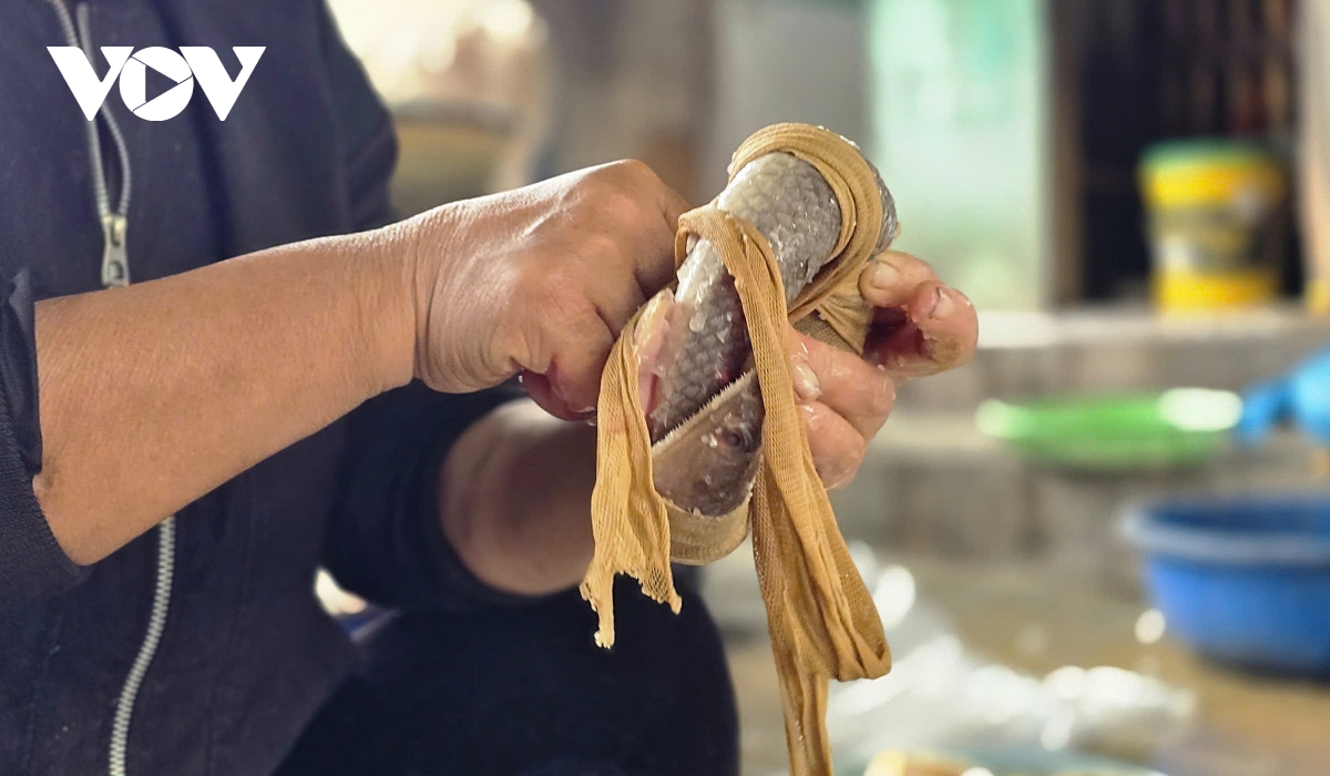 Cá chín sẽ được gắp lên phản tre trước khi đóng gói.(Ảnh: Hải Chi).