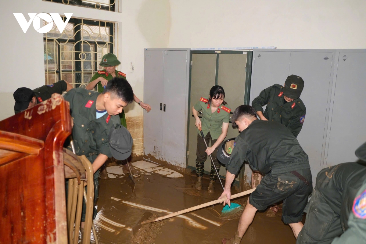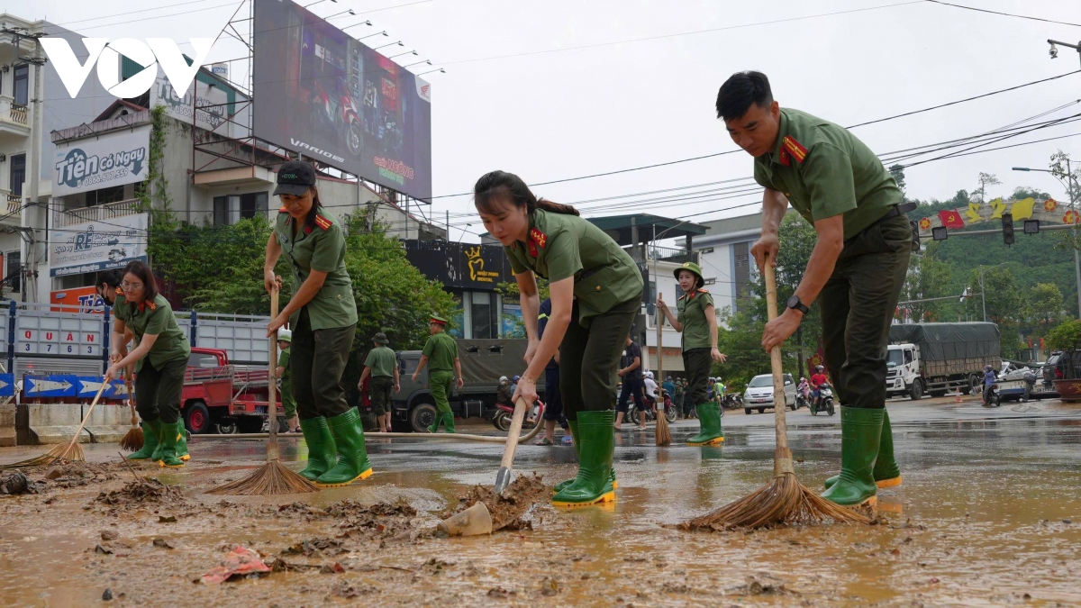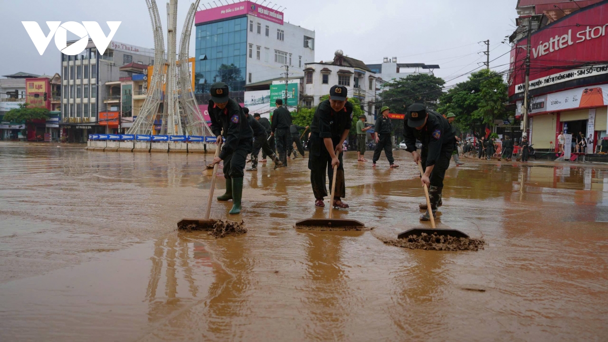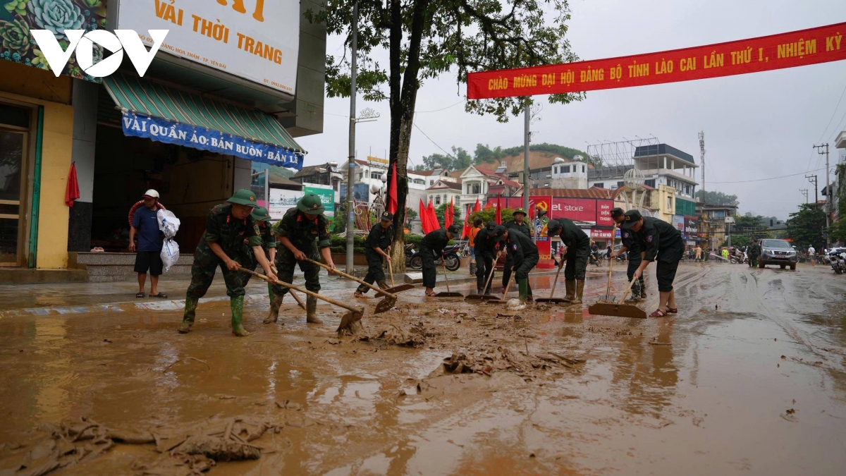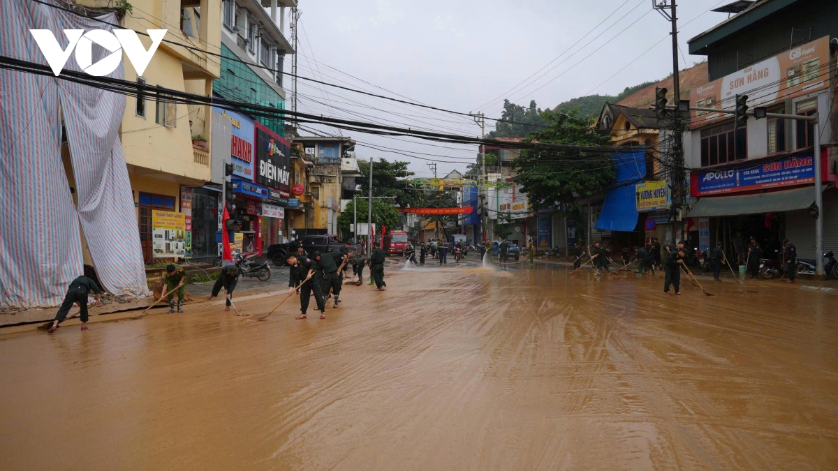 Từ sáng nay, lực lượng quân đội, công an, cán bộ, công chức, viên chức và các đoàn thể tỉnh Lào Cai đã có mặt tại vùng lũ cùng người dân bắt tay vào dọn dẹp bùn đất, rác