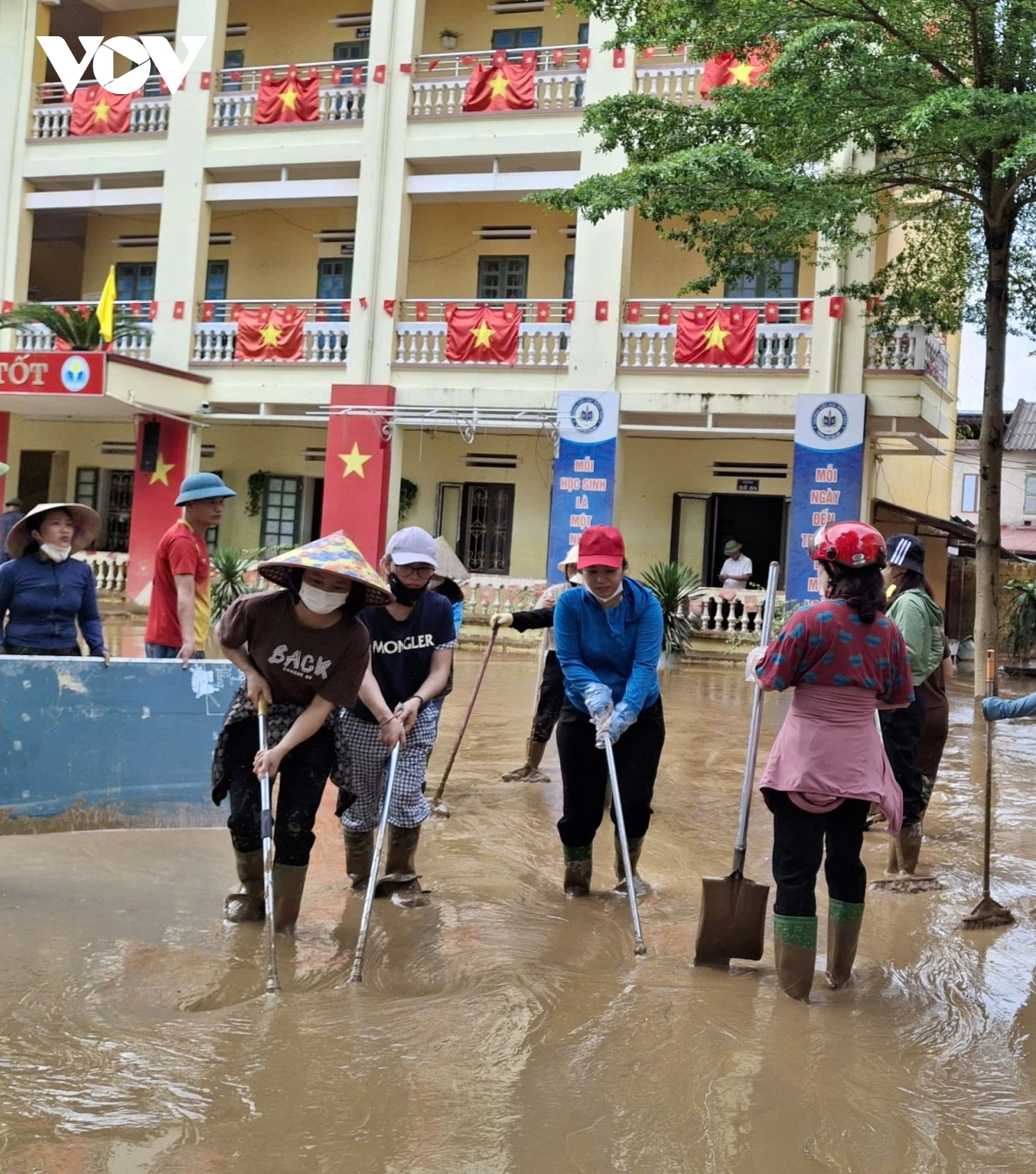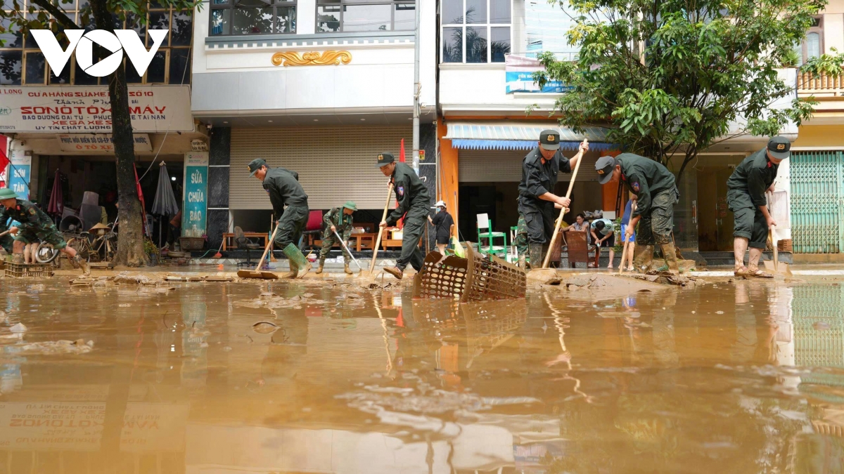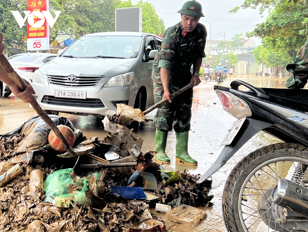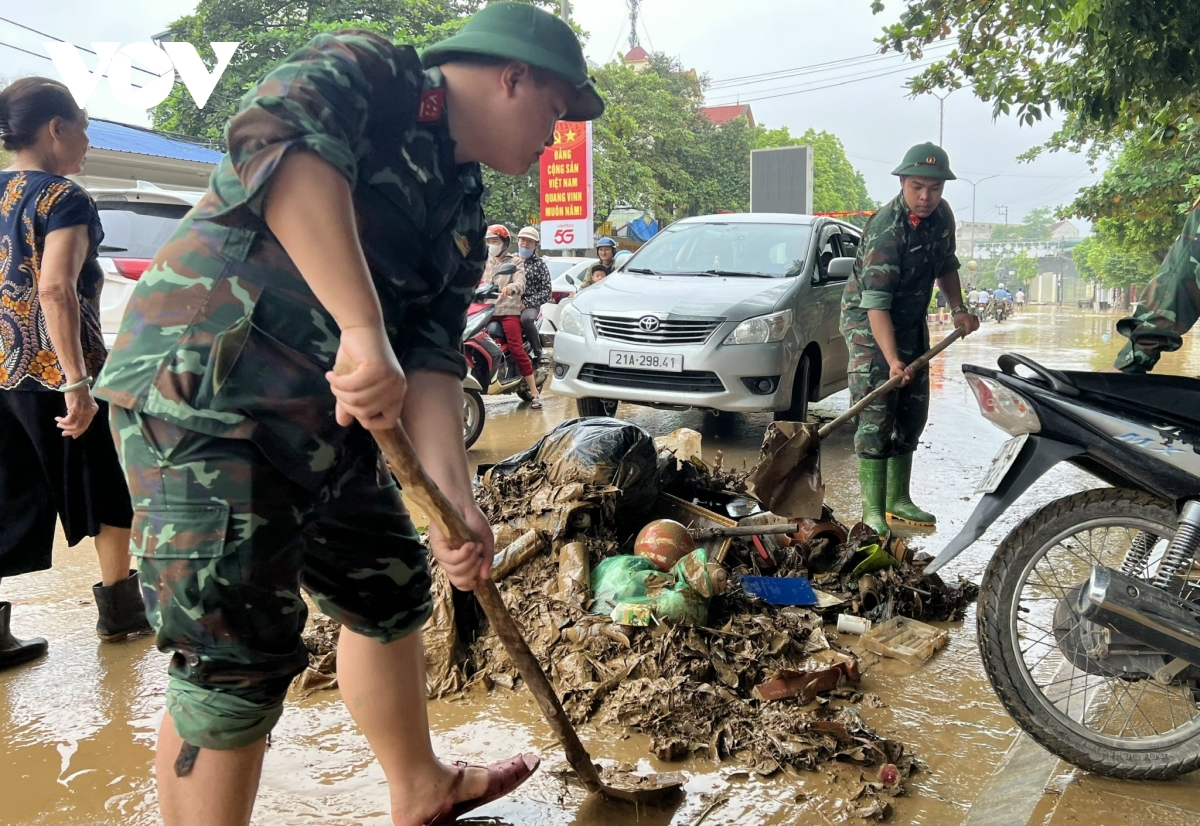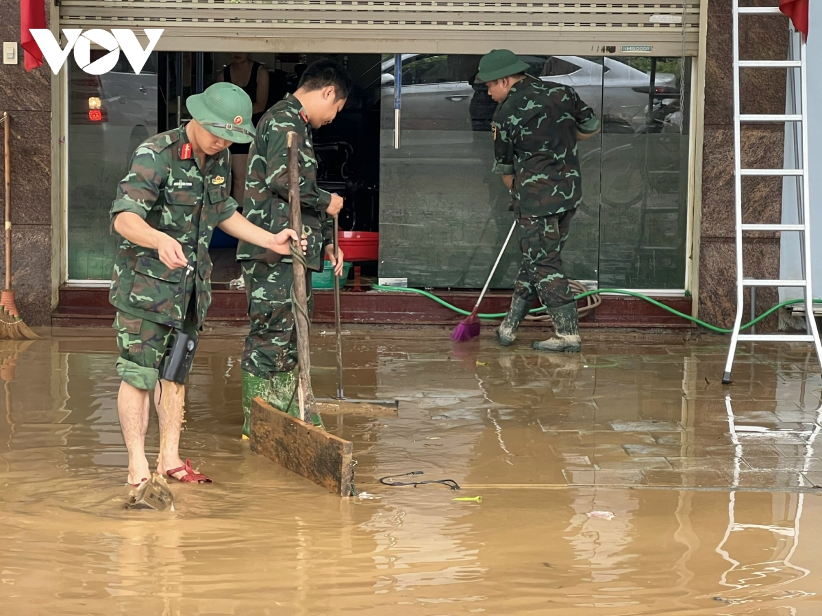 Từ sáng nay, lực lượng quân đội, công an, cán bộ, công chức, viên chức và các đoàn thể tỉnh Lào Cai đã có mặt tại vùng lũ cùng người dân bắt tay vào dọn dẹp bùn đất, rác