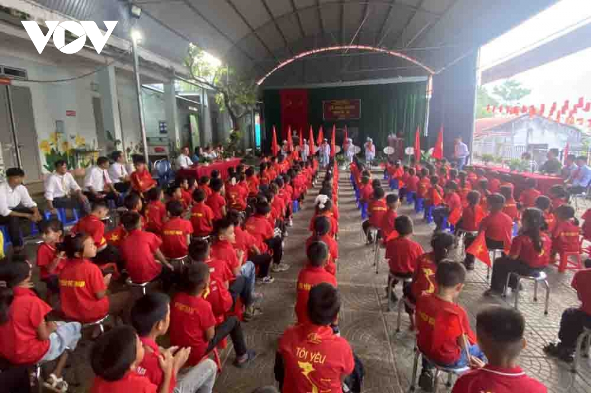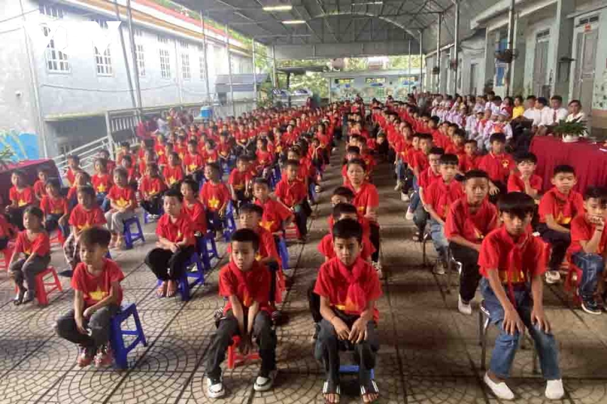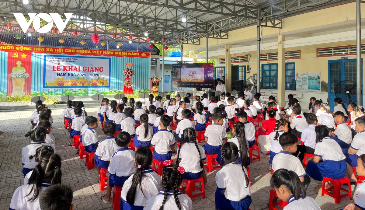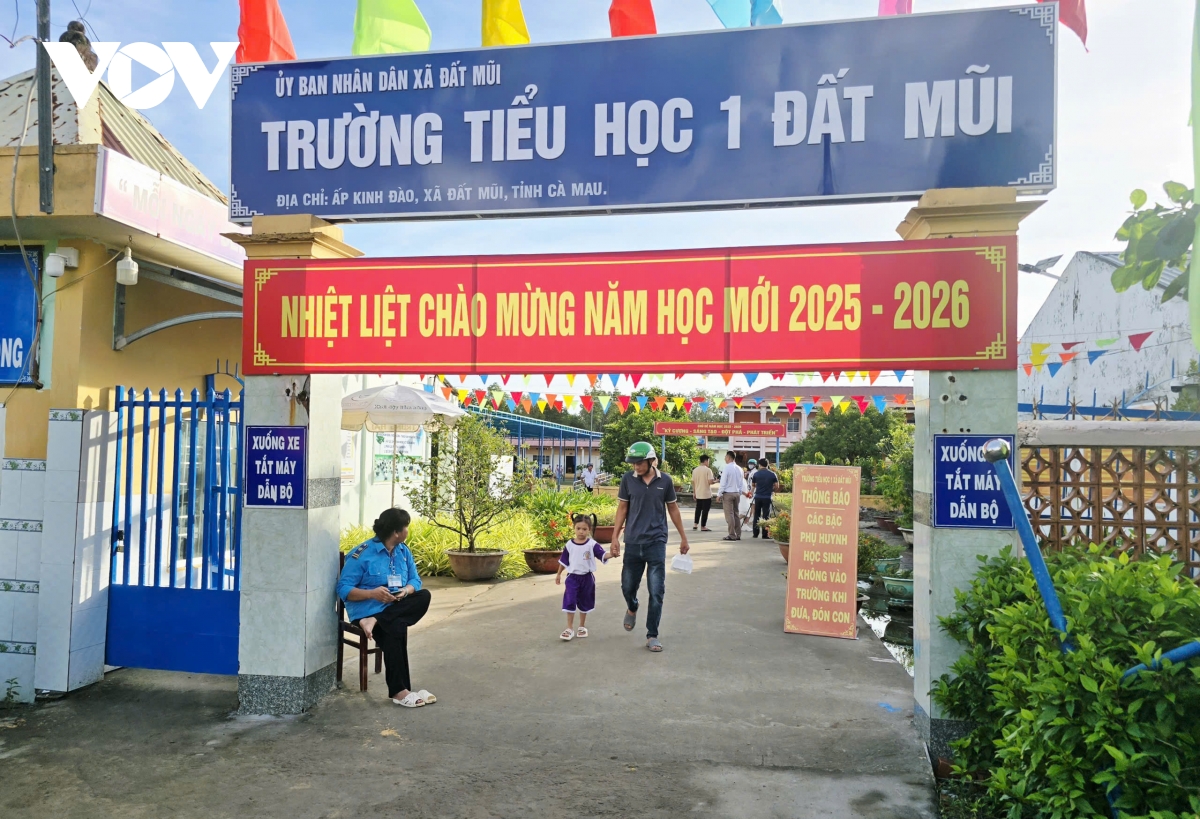 PV Trần Hiếu/VOV-ĐBSCL phản ánh: Từ khoảng 6 giờ sáng, ngày 5/9, tại Trường Tiểu học 1 Đất Mũi (xã Đất Mũi, tỉnh Cà Mau), các em học sinh bắt đầu đến trường để chuẩn bị cho lễ khai giảng chào đón năm học mới 2025-2026. Đây là ngôi trường đặc biệt nằm ở điểm Cực nam của Tổ quốc, nơi cô trò ngồi khai giảng có thể nghe được cả sóng biển rì rào.