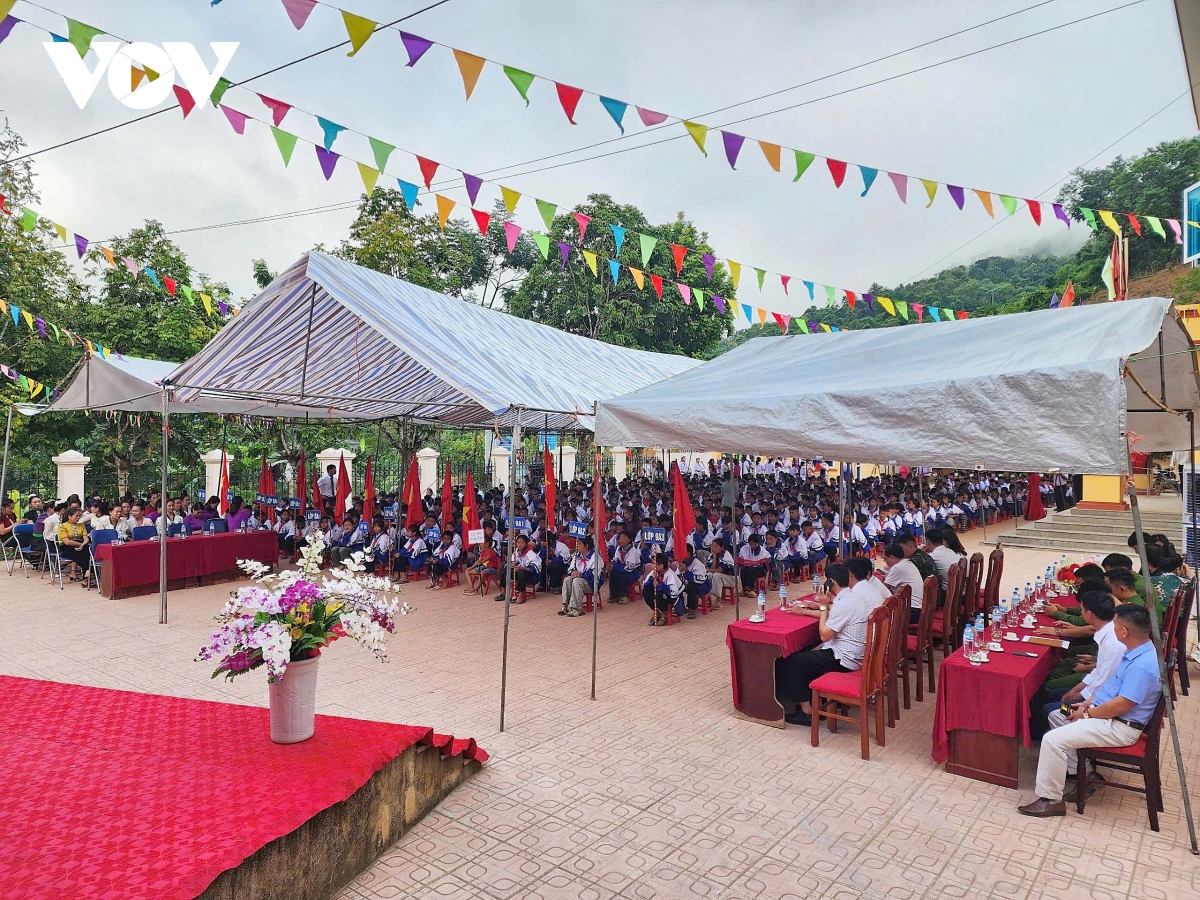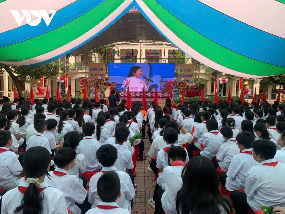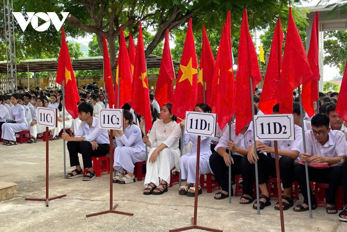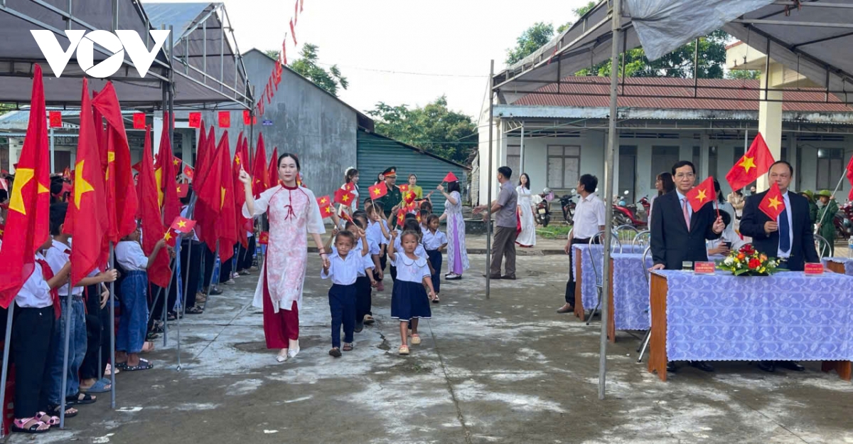 Phóng viên Bá Thăng/VOV.VN tại Nghệ An đưa tin Lễ khai giảng năm học 2025-2026 gắn với hoạt động kỷ niệm 80 năm thành lập Bộ Quốc gia Giáo dục (nay là Bộ Giáo dục và Đào tạo) tại 1517 Nghệ An chính thức bắt đầu từ 7h sáng. Mặc dù bị chịu thiệt hại nặng nề nề do ảnh hưởng của 3 cơn bão trong vòng chưa đầy 2 tháng nhưng ngành giáo dục tỉnh Nghệ An đã kịp thời hoàn tất việc khắc phục và chuẩn bị đầy đủ các điều kiện để tổ chức khai giảng đúng thời gian theo kế hoạch của Bộ Giáo dục và Đào tạo. Từ đồng bằng cho tới miền núi, không khí hân hoan, rộn ràng, rợp cờ hoa đón chào năm học mới.