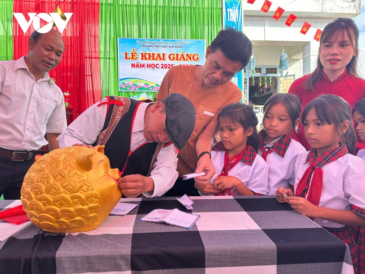 Ngay từ sáng sớm, một chú heo đất nhỏ được đặt trang trọng trên bục lễ, trở thành biểu tượng của tình yêu thương và sự sẻ chia. Giáo viên, phụ huynh, học sinh cùng nhiều cán bộ xã Tu Mơ Rông đã tham gia góp tiền, nuôi heo, gây quỹ, nhiều em còn mang theo mì tôm để ủng hộ các bạn có hoàn cảnh khó khăn. Em A Nhật Thiên Hưng, học sinh lớp 5A1, cũng đã tham gia ủng hộ, bày tỏ niềm vui khi được góp phần giúp đỡ các bạn nghèo.