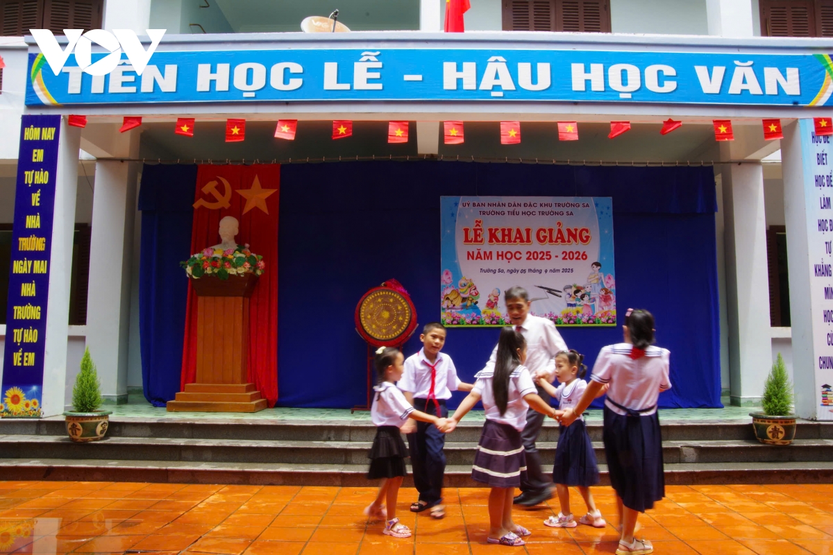 PV Thái Bình/VOV-Tây Nguyên cho biết, tại đặc khu Trường Sa, tỉnh Khánh Hòa, nơi đầu sóng ngọn gió, sáng 5/9 rộn ràng trong tiếng trống khai trường hòa cùng cả nước bước vào năm học mới 2025 – 2026. Giữa biển trời mênh mông, sân trường nhỏ rực rỡ cờ hoa, những hàng ghế ngay ngắn, phông màn gọn gàng, tạo nên không gian ấm áp giữa đảo xa.