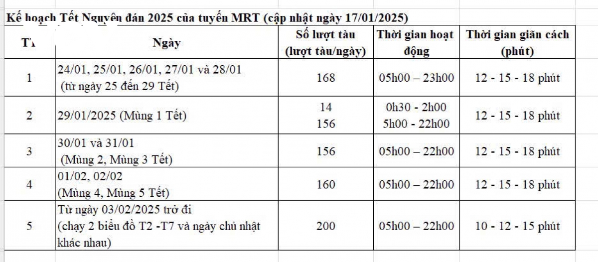 Từ 30/1 đến 2/2 (tức mùng 2-5 Tết), metro 1 hoạt động từ 5-22h.