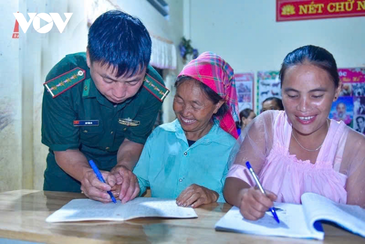VOV.VN - 7h tối mùa đông, giáp Tết, khi nhà nhà người người về quây quần bên mâm cơm, bếp lửa, lớp học xóa mù chữ của Thiếu tá - thầy giáo Hơ Văn Di, Bộ đội Biên Phòng Thanh Hóa tại xã biên giới Trung Lý, huyện Mường Lát, Thanh Hóa lại sáng đèn, vang vọng tiếng tập đọc, tiếng đánh vần.