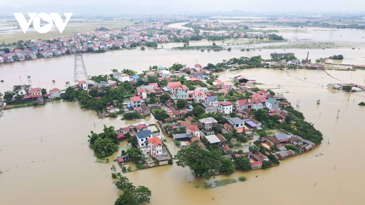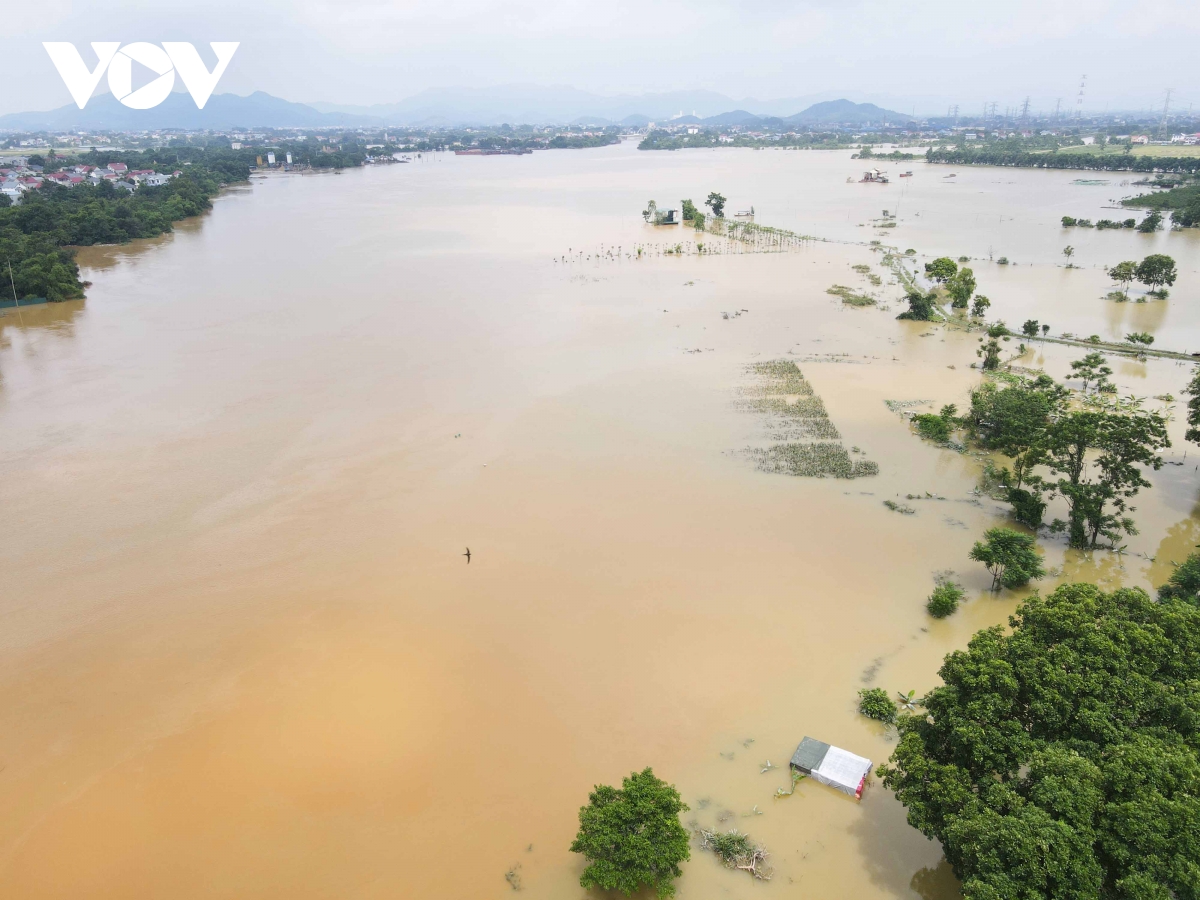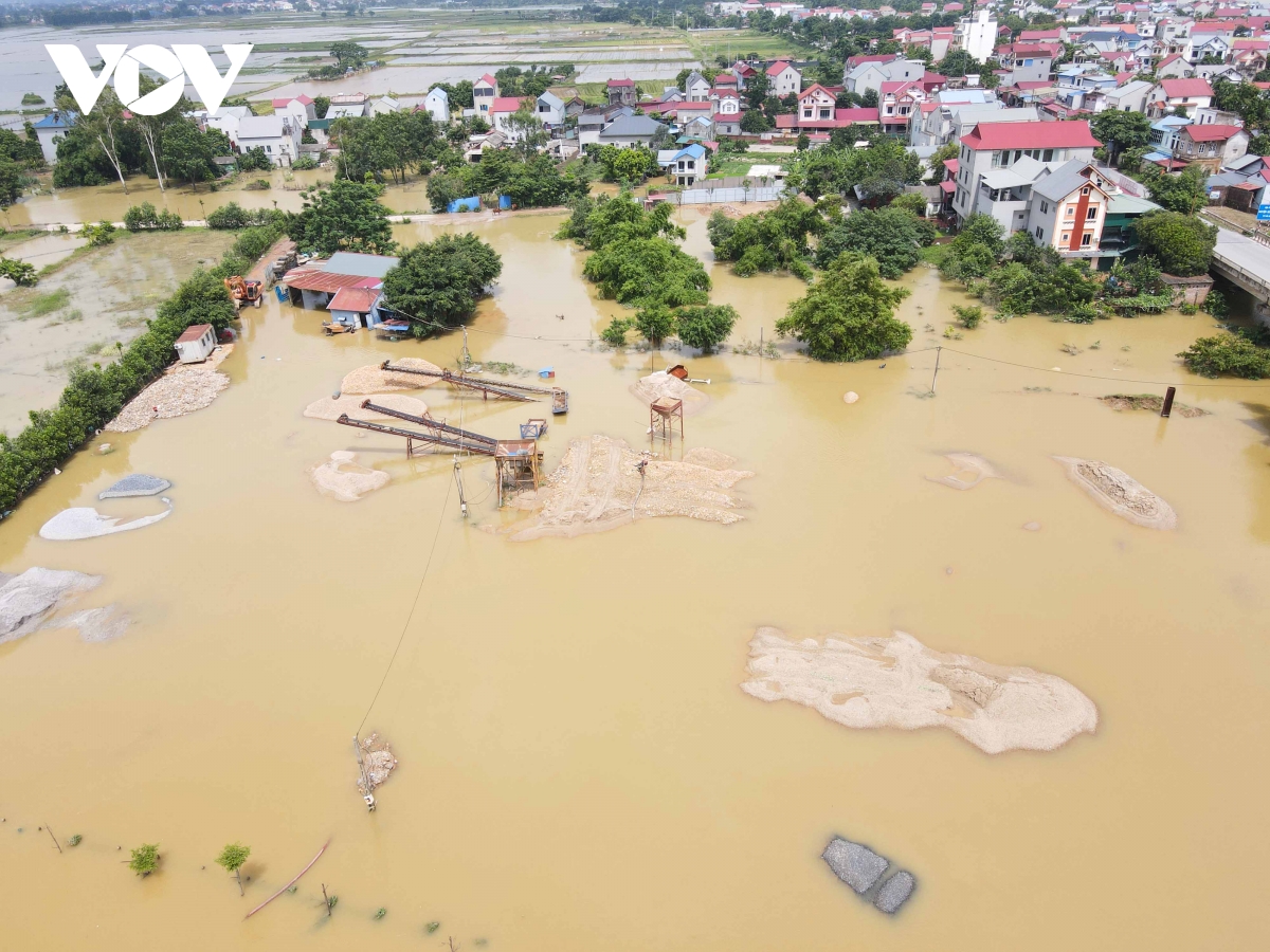 Từ góc nhìn trên cao mực nước sông Cầu dâng cao khiến người dân xã Mai Trung, huyện Hiệp Hòa bị cô lập trong biển nước do nằm ở vị trí có lưu vực dòng sông di chuyển mạnh.