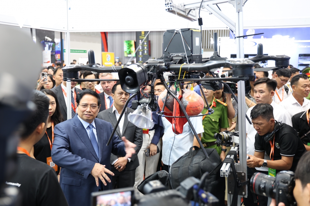 Thủ tướng Phạm Minh Chính tham quan các gian hàng tại triển lãm. (Ảnh: Tỷ Huỳnh)
