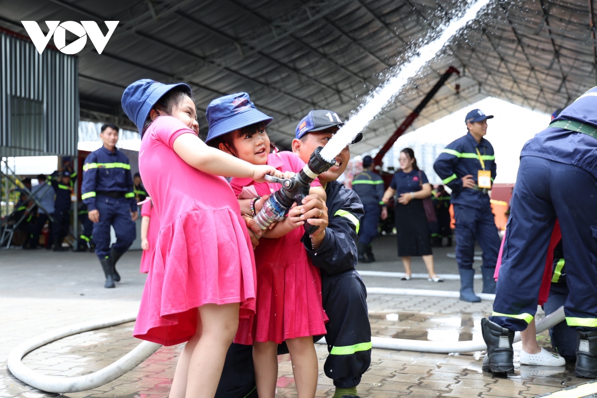 Tại triển lãm, người dân còn được trải nghiệm hoá thân thành chiến sĩ Cảnh sát PCCC được hướng dẫn sử dụng phương tiện, thiết bị phòng cháy, chữa cháy, sơ cấp cứu ban đầu, di chuyển thoát nạn.