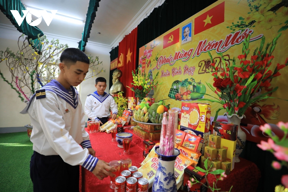 Chiến sĩ đảo Song Tử Tây chăm chút trang trí bàn thờ Bác và mâm ngũ quả ngày Tết. Giữa muôn trùng sóng dữ, sắc hoa rực rỡ và chân dung Bác Hồ trên bàn thờ Tổ quốc đã mang hơi ấm đất liền lan tỏa khắp không gian đảo xa.