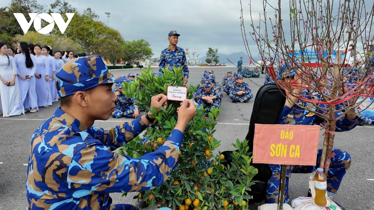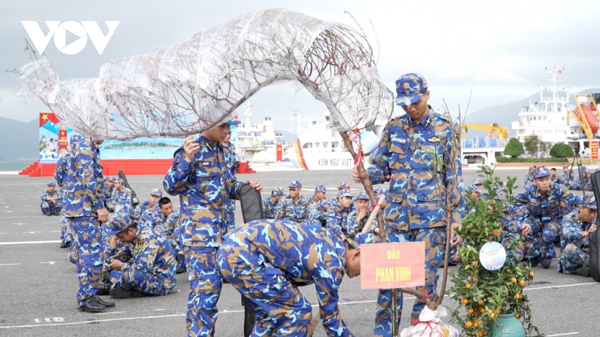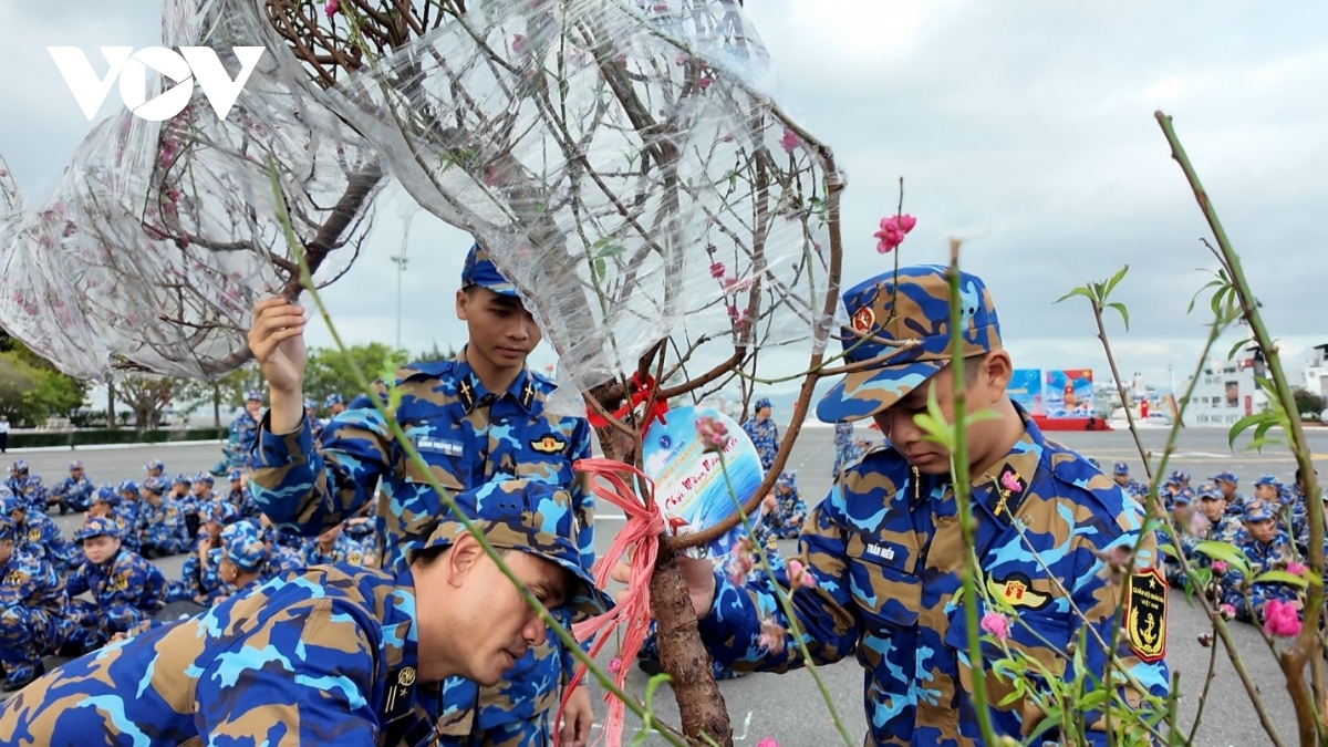 Giữa nắng gió trùng khơi, quân và dân trên các đảo vẫn duy trì nét đẹp ngày Tết với bánh chưng xanh, bàn thờ Tết trang nghiêm, ấm cúng và sắc hoa rực rỡ từ mọi miền Tổ quốc. (Trong ảnh: Những gốc đào rực rỡ và chậu quất trĩu quả được các chiến sĩ bao bọc kỹ lưỡng tiến ra đảo xa).