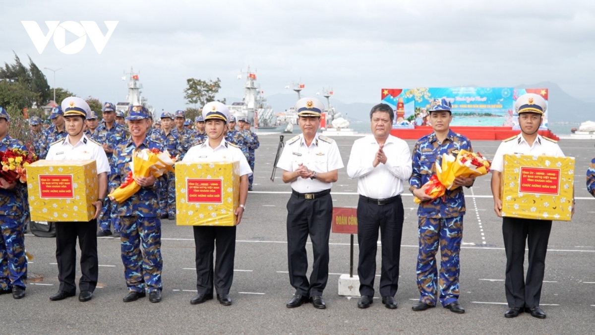 Ông Trần Phong - Chủ tịch UBND tỉnh Khánh Hòa thay mặt Tỉnh ủy - HĐND - UBND tỉnh Khánh Hòa tặng hoa và quà cho Đoàn công tác và các lực lượng đi thăm, chúc Tết Đặc khu Trường Sa dịp Tết Nguyên đán Bính Ngọ 2026.