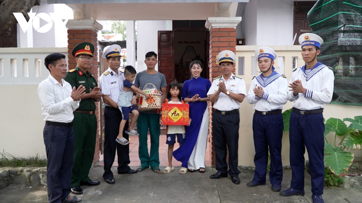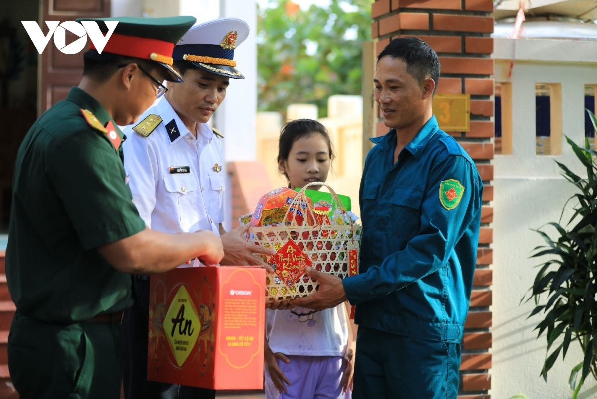 Thượng tá Nguyễn Duy Bá, Chính ủy Lữ đoàn 146, Bộ Tư lệnh Vùng 4 Hải quân cùng Cán bộ, chiến sĩ tặng quà chúc Tết người dân trên đảo Song Tử Tây.