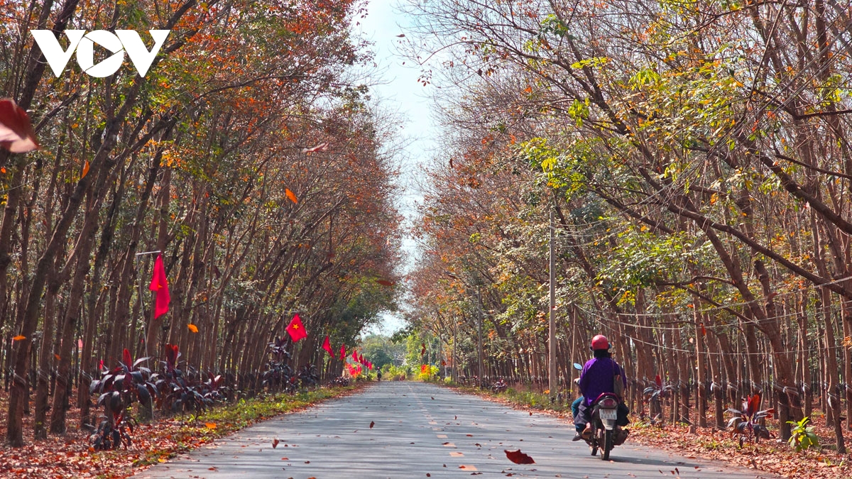 Khoảng cuối tháng 12, cây cao su bắt đầu bước vào mùa thay lá. Những chiếc lá xanh mướt dần chuyển sang màu vàng, cam rồi đỏ rực, tạo nên một khung cảnh vô cùng ấn tượng. Những cánh rừng cao su bạt ngàn, với hàng triệu chiếc lá chuyển màu vàng, đỏ rực rỡ, đã tạo nên một khung cảnh thiên nhiên tuyệt đẹp, khiến bất kỳ ai có dịp đặt chân đến đây đều không khỏi ngỡ ngàng.