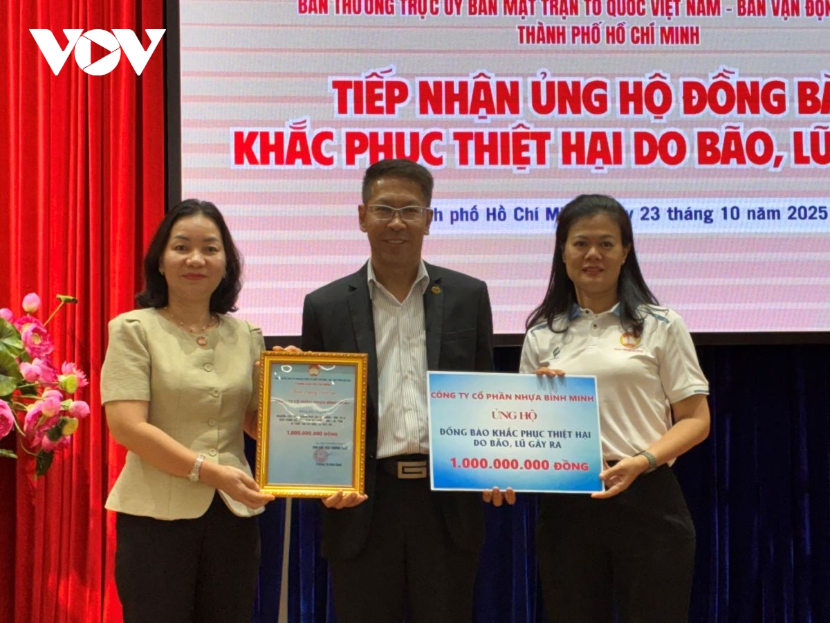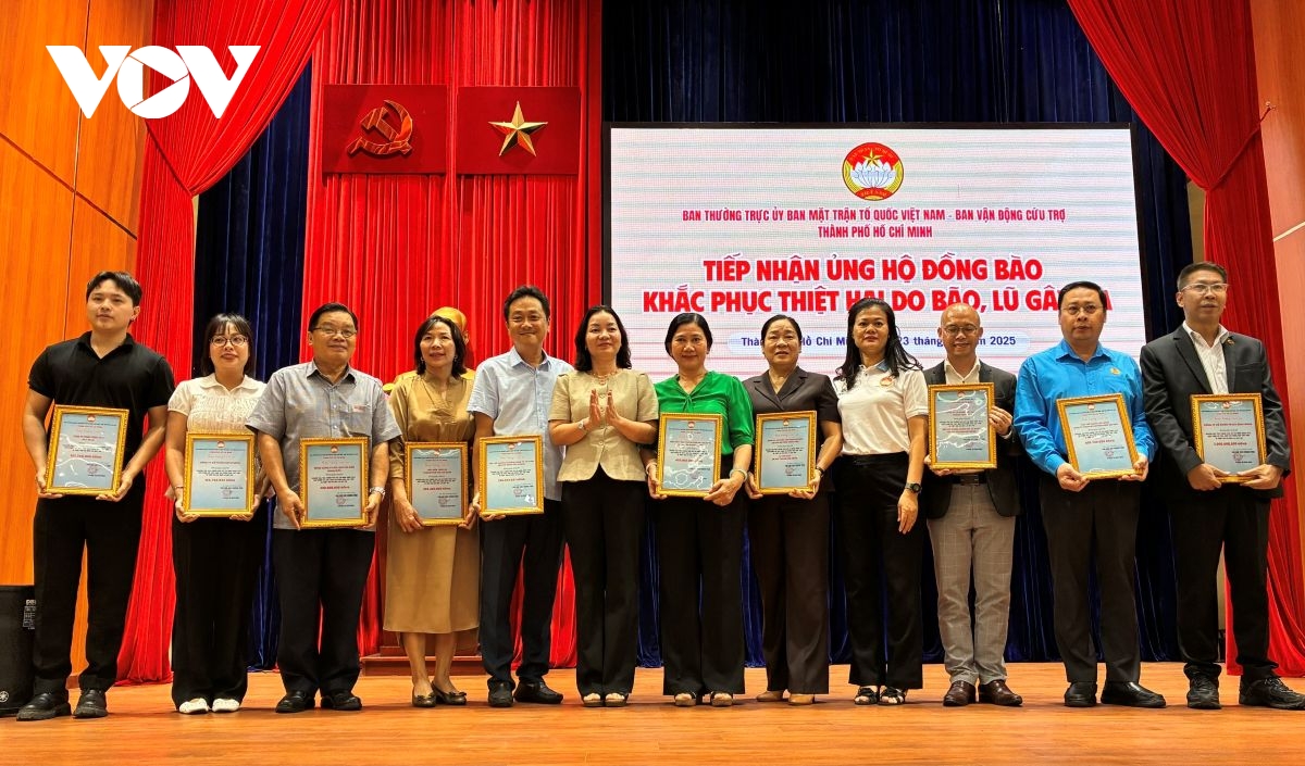 VOV.VN - Chiều 23/10, thêm 32 đơn vị, doanh nghiệp, cá nhân đăng ký ủng hộ đồng bào vùng bão, lũ thông qua MTTQ TP.HCM. Đến nay, Thành phố đã chuyển khẩn cấp 112 tỷ đồng cùng nhiều hàng hóa thiết yếu đến các địa phương, thể hiện tinh thần “TP.HCM vì cả nước, cùng cả nước.”