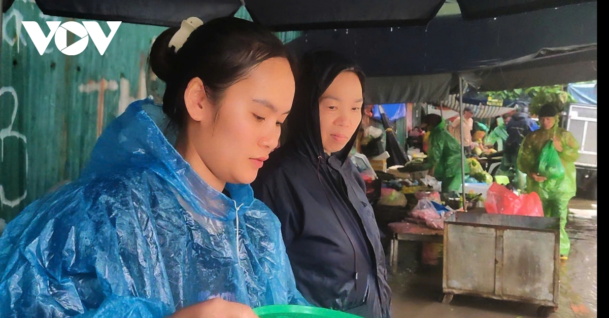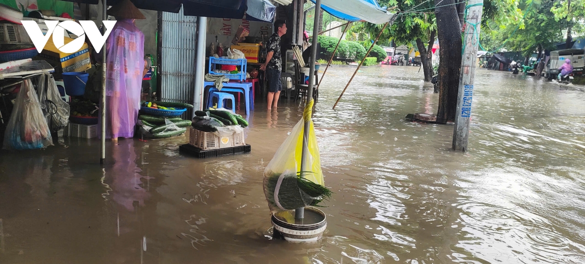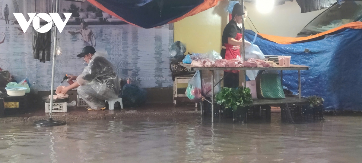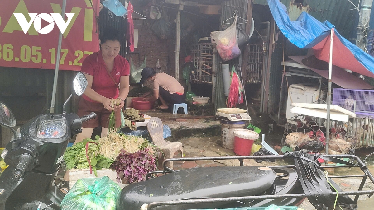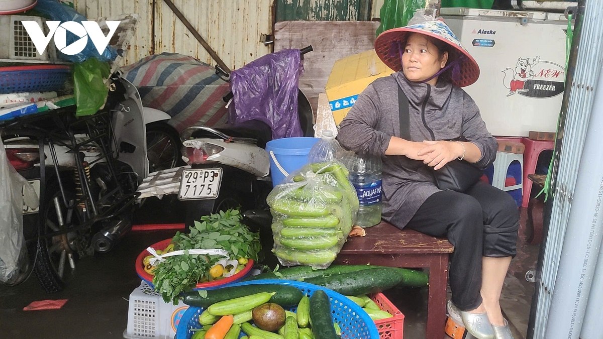 Chị Trương Thị Ngọc, một tiểu thương chia sẻ: mưa gió, ngập đường khiến việc bán hàng trở nên vất vả, ế ẩm hơn hẳn. “Tôi bán giò chả, dậy từ 2h sáng, nhưng không bán được nhiều như mọi khi, đành mang về cho con ăn”.