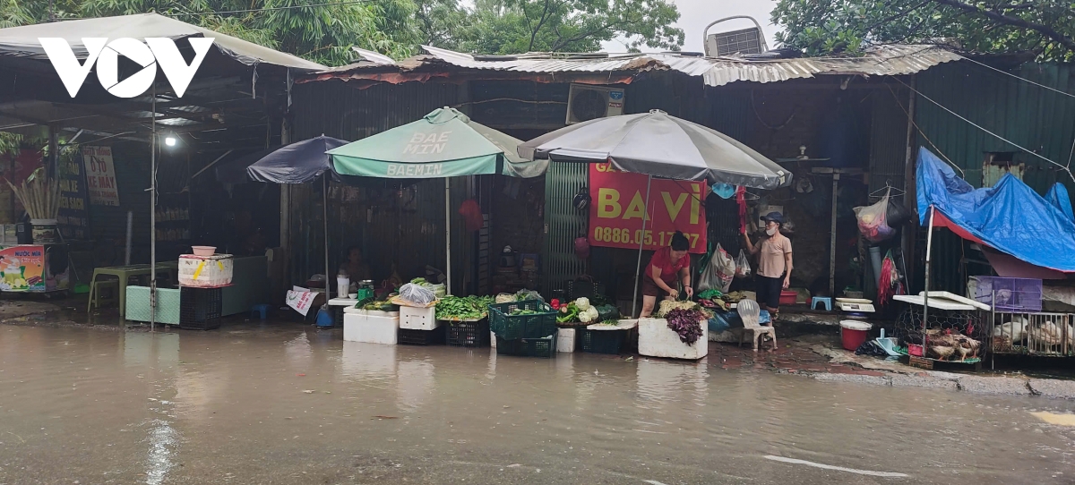 Do ảnh hưởng của bão số 5, cơn mưa lớn kéo dài từ đêm qua đến sáng nay khiến nhiều tuyến đường ở Hà Nội ngập sâu, giao thông tê liệt. Tuy nhiên, tại chợ cóc trên đường Trần Quốc Vượng, phường Cầu Giấy, các tiểu thương vẫn bày hàng phục vụ người dân.