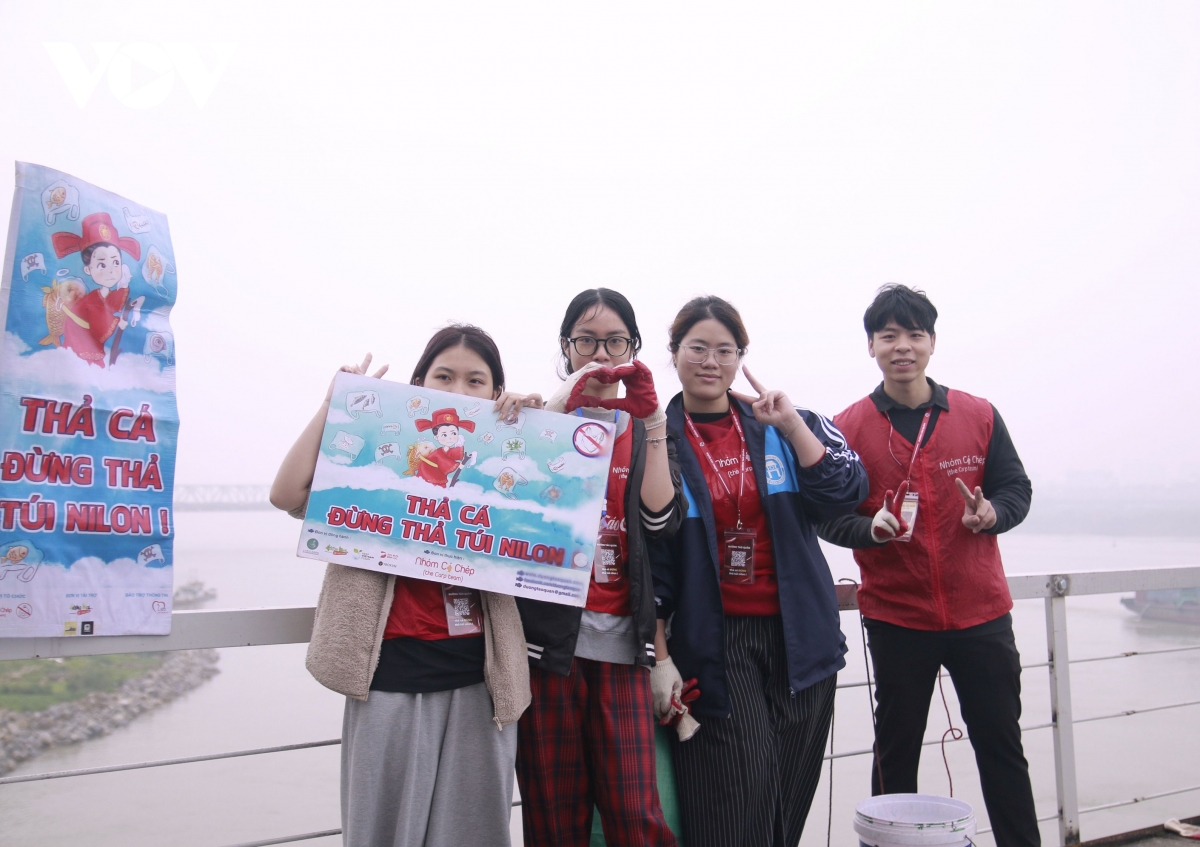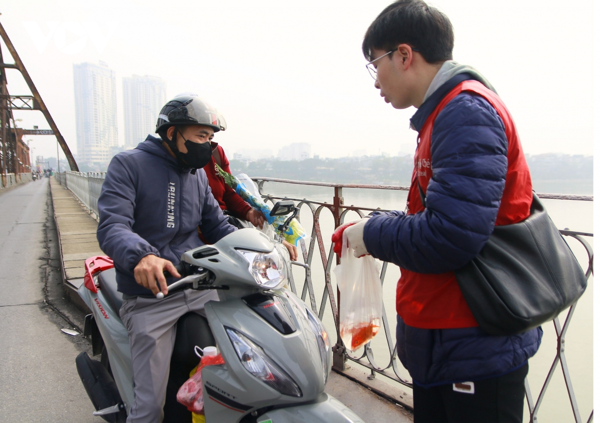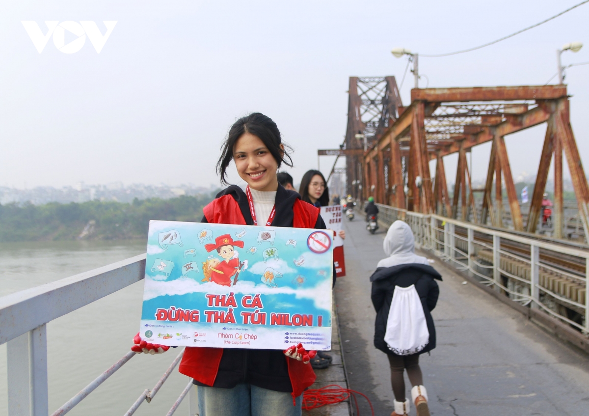 Tại khu vực cầu Long Biên, như thường lệ, tới ngày tiễn ông Táo về trời, nhiều bạn trẻ đã có mặt tại cầu Long Biên với những banner biểu ngữ tuyên truyền vận động người dân "thả cá đừng thả túi nilon" để bảo vệ môi trường.