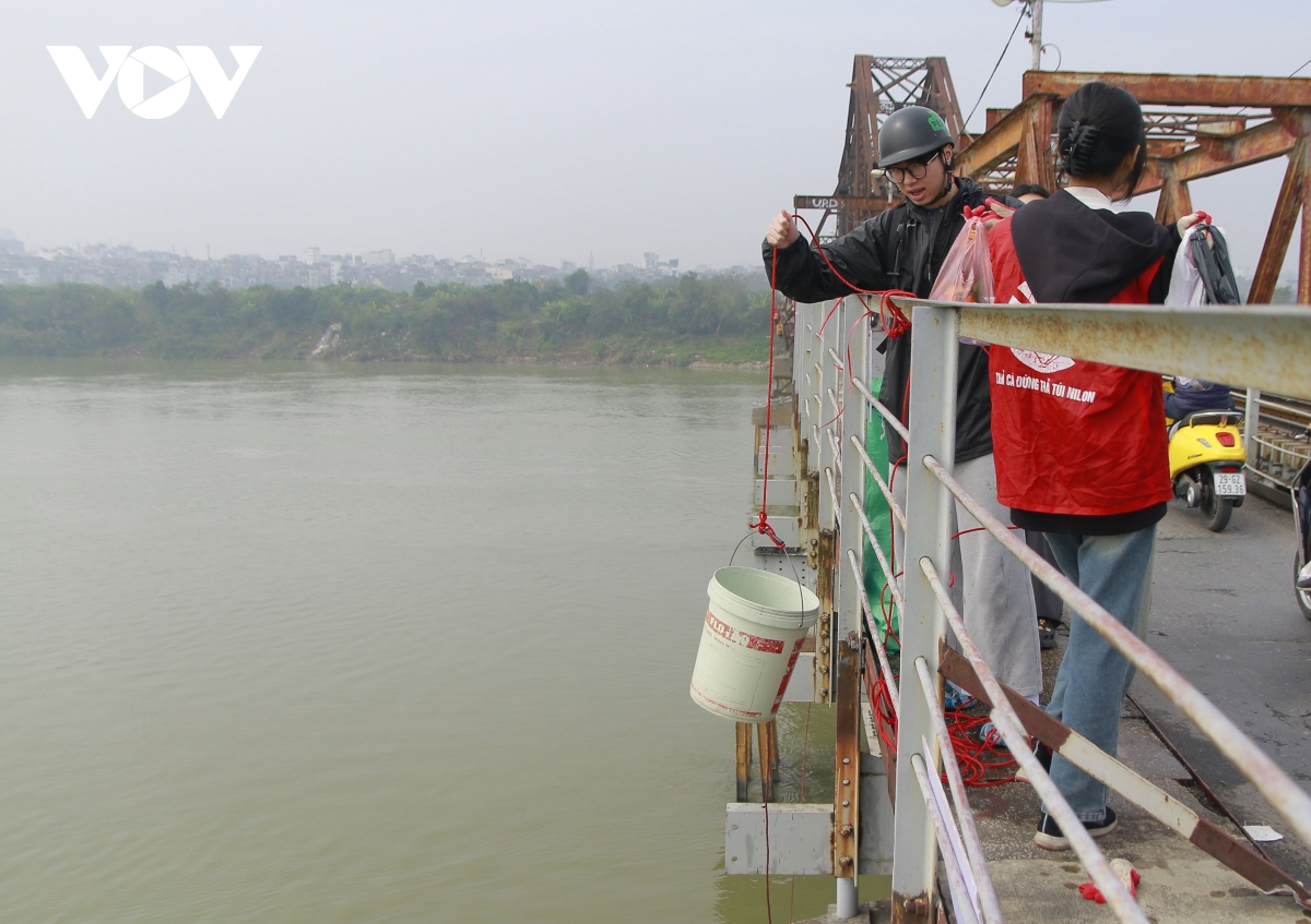 Nhiều người đã gửi gắm việc thả cá tới tay thành viên trong nhóm bằng cách đưa cá vào xô nhựa rồi thả dây từ cầu Long Biên xuống sát mặt nước sông Hồng.