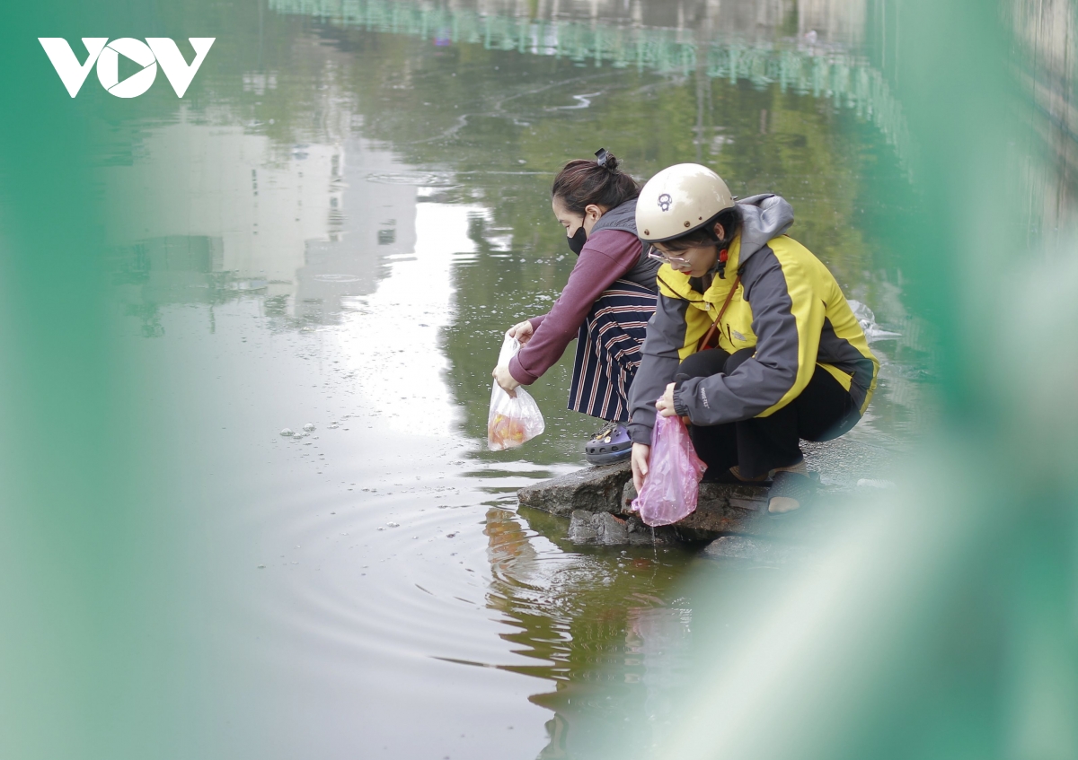 VOV.VN - Sáng 23 tháng Chạp, sau khi làm lễ cúng ở nhà, nhiều người dân đã ra các ao, hồ thả cá chép, tiễn ông Công ông Táo về trời theo phong tục truyền thống. Tại các điểm thả cá đều có lực lượng chức năng và các nhóm tình nguyện viên hỗ trợ giúp người dân thả cá an toàn, không ô nhiễm môi trường.