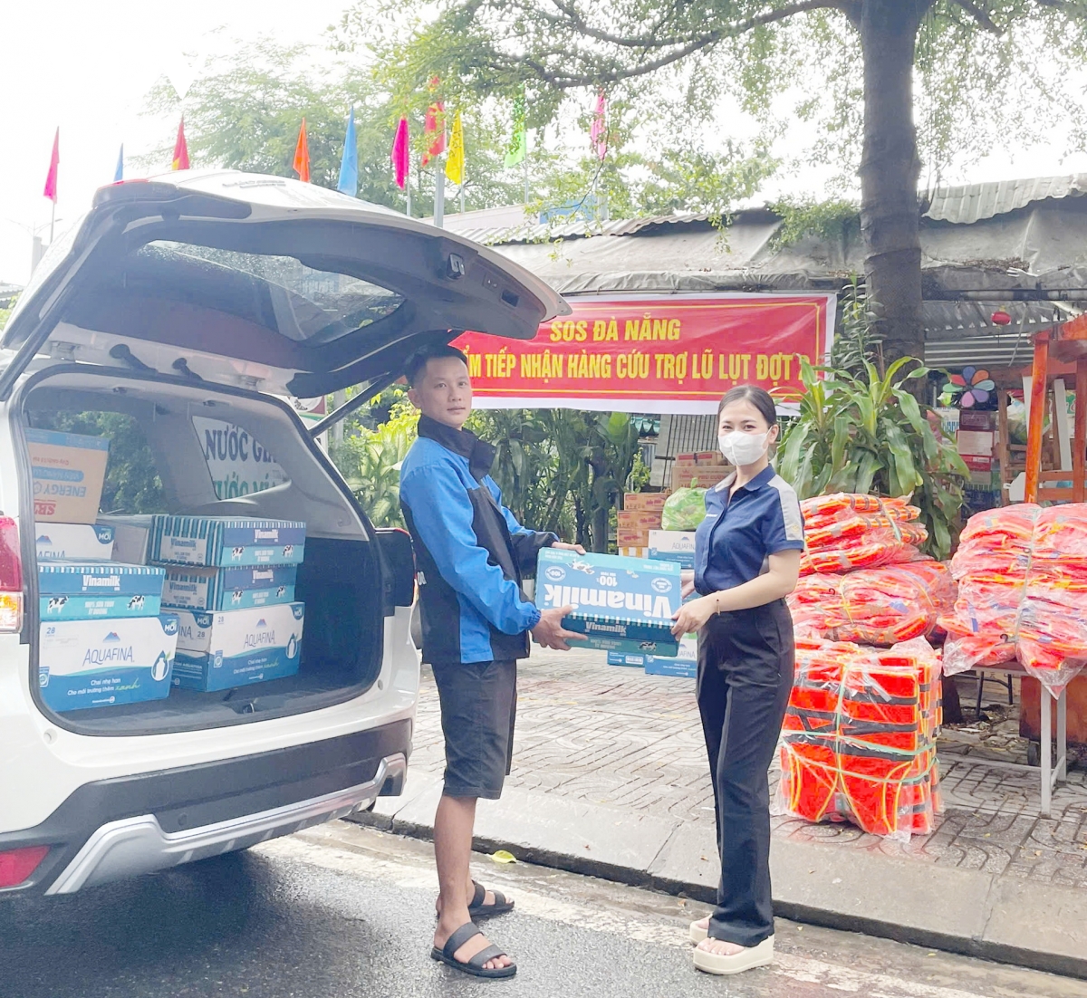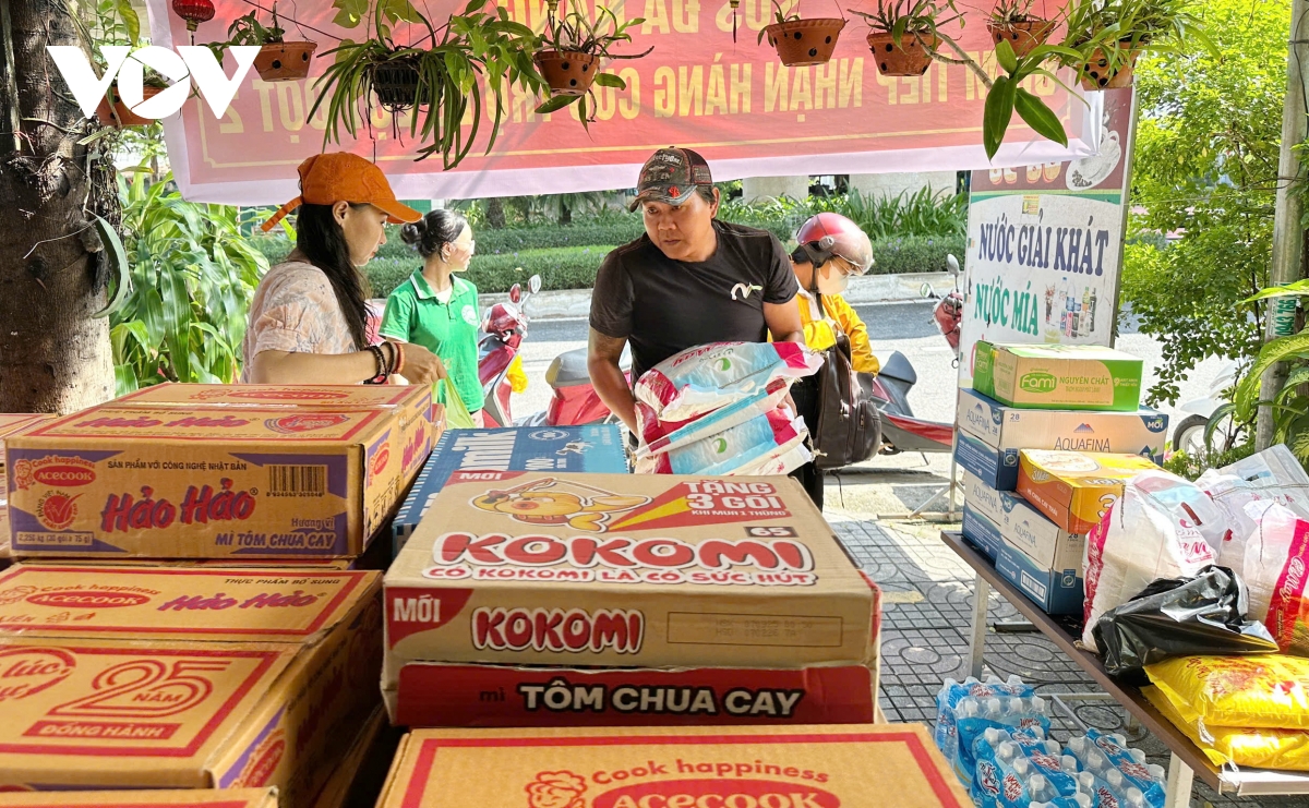 Tại các điểm tiếp nhận hàng cứu trợ của Câu lạc bộ thiện nguyện SOS Đà Nẵng, địa chỉ tại số nhà 26, đường Tôn Đức Thắng, phường Hòa Khánh và số 59 đường Hà Thị Thân, phường An Hải, thành phố Đà Nẵng trở nên nhộn nhịp.