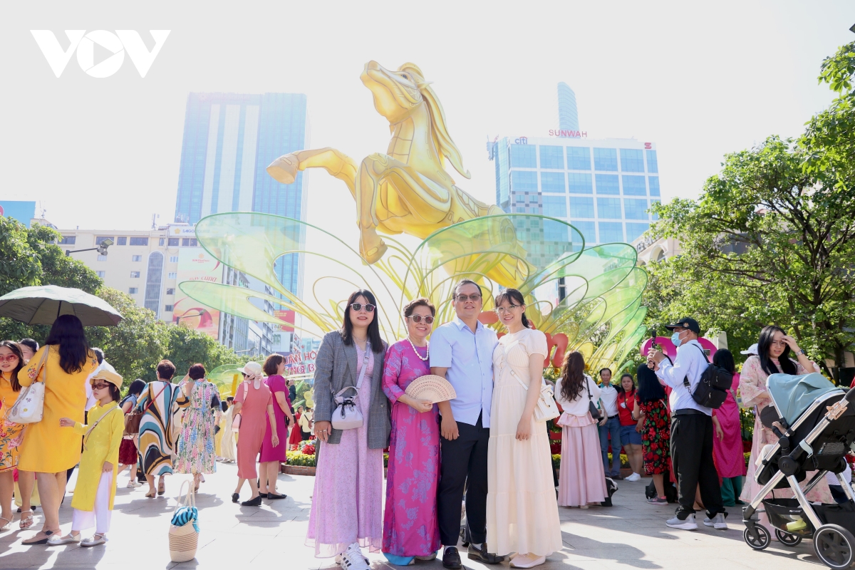 Các gia đình, nhóm bạn trẻ, thậm chí cả du khách nước ngoài cũng diện áo dài truyền thống, bất chấp cái nắng khá gắt, thích thú lưu lại khoảnh khắc du xuân giữa không gian ngập tràn sắc hoa và linh vật năm Ngọ.