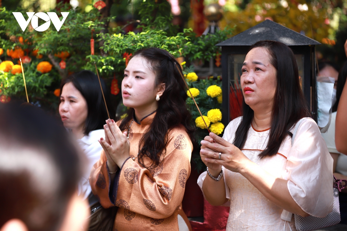 Tại chùa Phước Hải, nhiều phật tử phải đứng ngoài sân chắp tay khấn vọng khi không thể vào chính điện. Dù lượng người đông hơn thường ngày, không khí vẫn nền nã, trật tự.