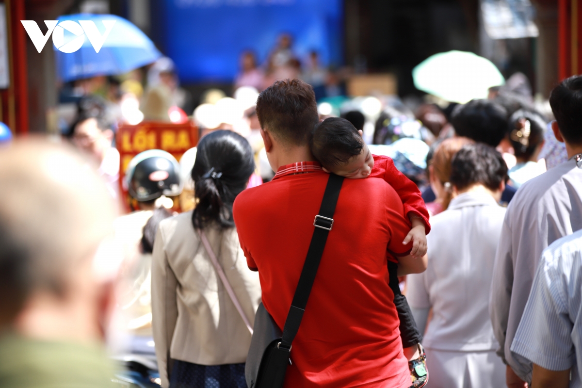 Dòng người nối dài từ cổng chùa vào đến khu chính điện. Ai cũng ăn mặc chỉnh tề, tay cầm hoa tươi, nhang đèn, lễ vật được chuẩn bị gọn gàng.