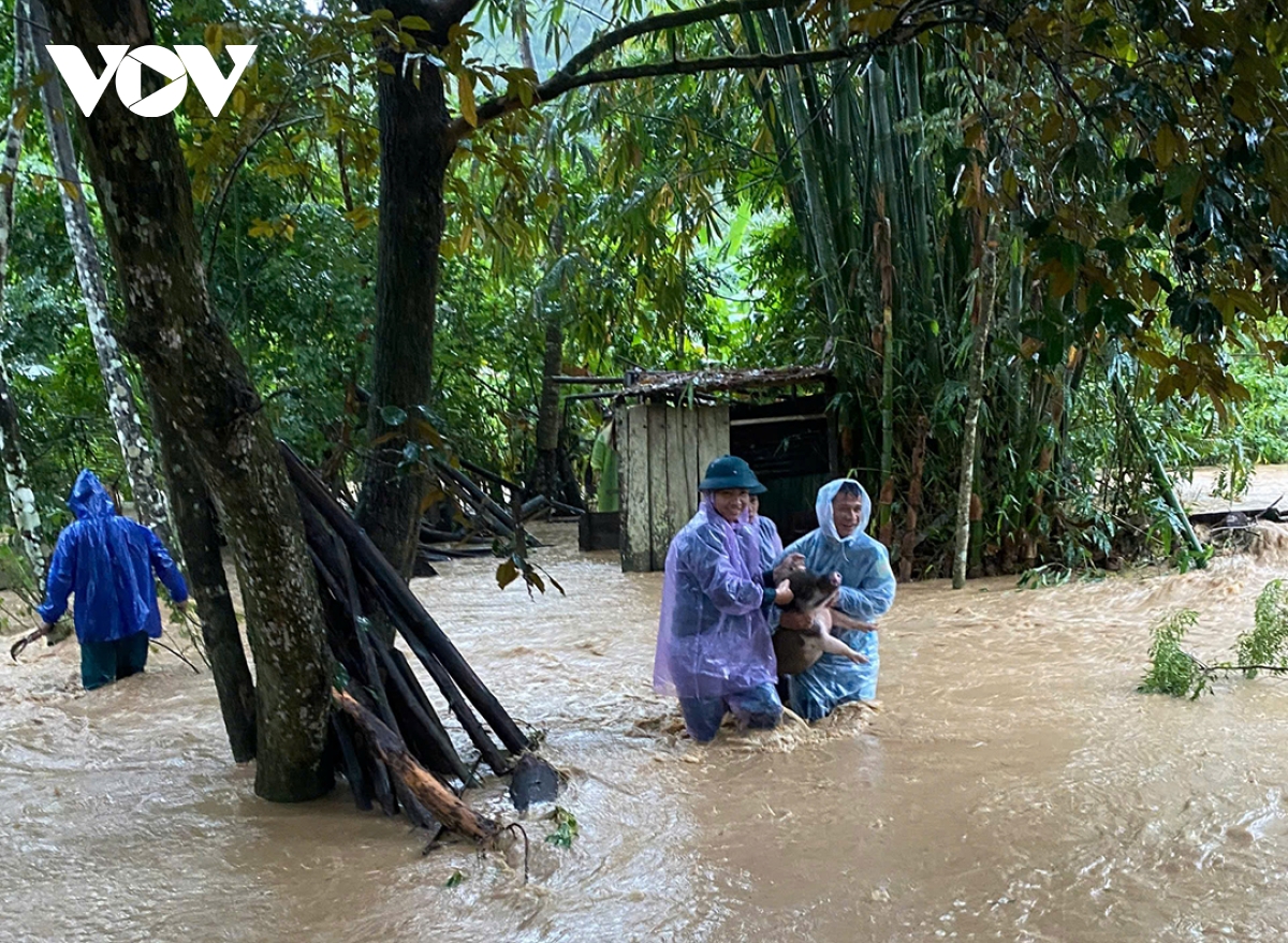 Chính quyền địa phương đến hỗ trợ dân chuyển vật nuôi đến nơi cao để đảm bảo an toàn