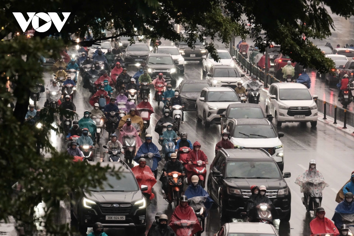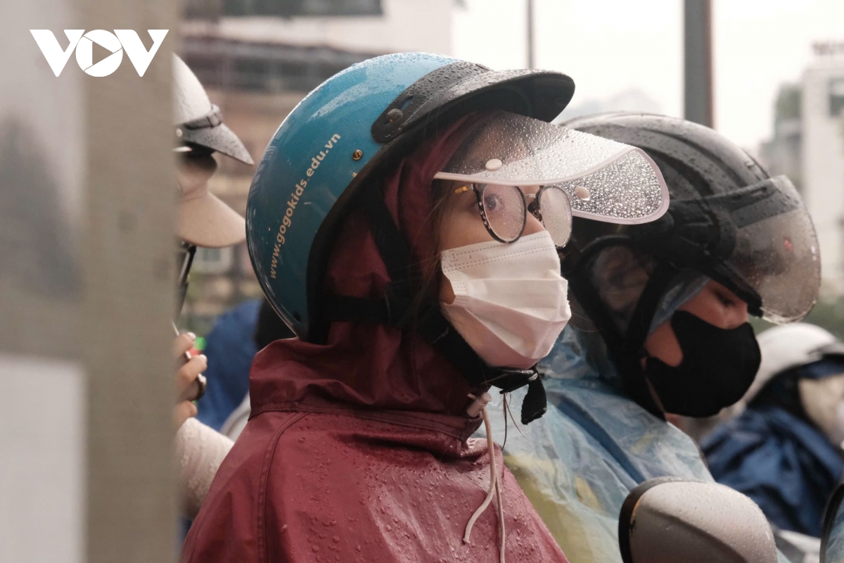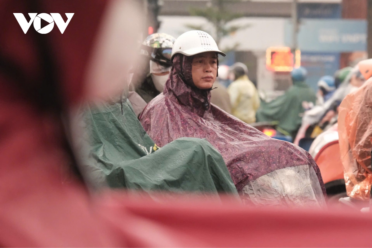 VOV.VN - Từ rạng sáng, mưa nhỏ kéo dài kèm gió lạnh khiến nhiều hoạt động thường ngày của người dân Hà Nội bị xáo trộn. Đến giờ cao điểm, mưa rét càng làm đường phố ùn ứ nặng, phương tiện ken đặc trên các trục đường chính giữa tiết trời đầu đông.