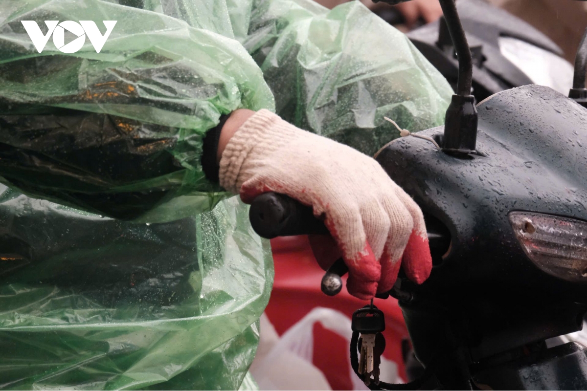 Những đôi găng tay đã được người dân mang ra dùng từ sớm, mưa lạnh hòa cùng gió đầu ngày khiến cái buốt nơi phố xá càng thêm rõ rệt.