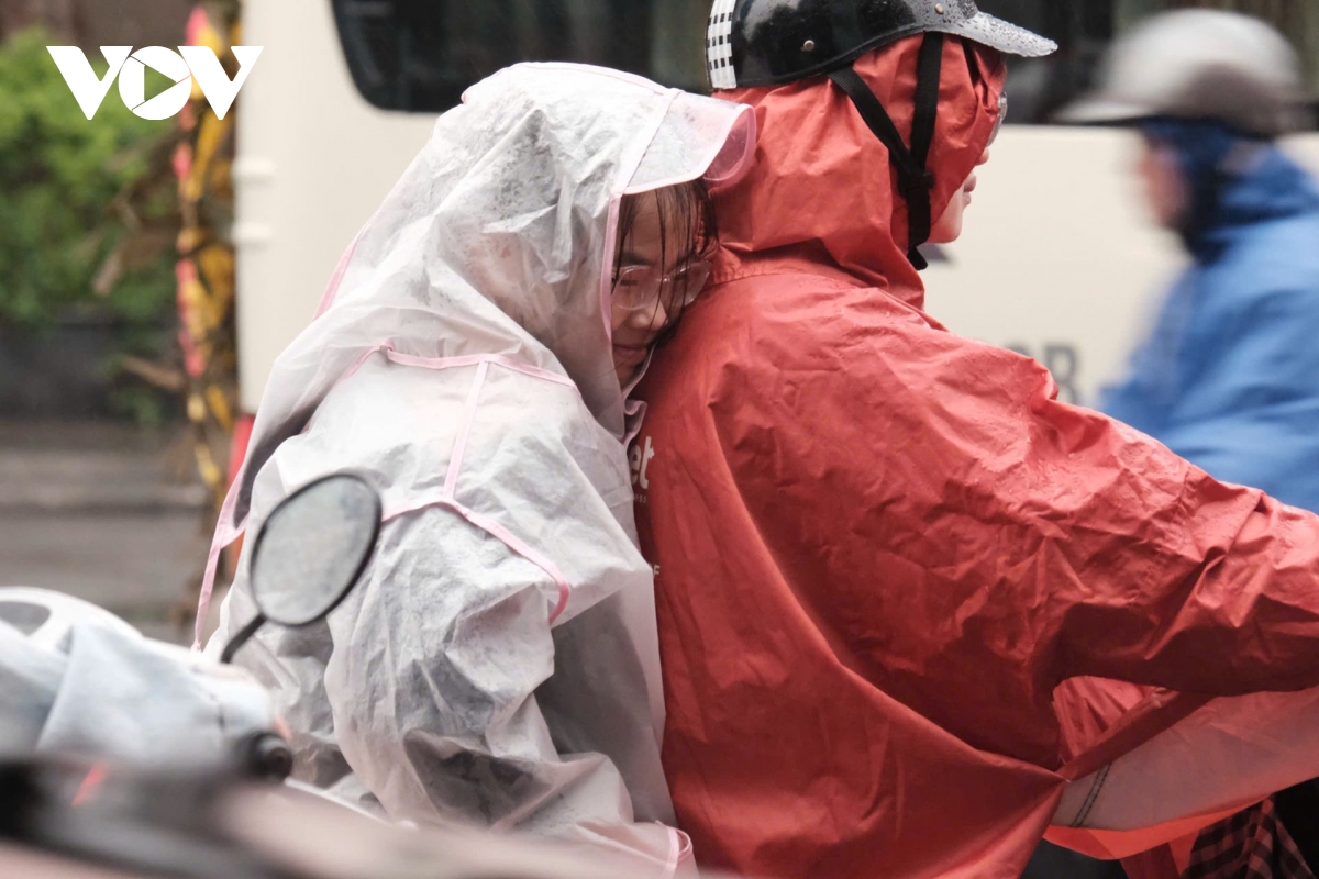 Trên chiếc xe máy len lỏi giữa dòng người giờ cao điểm, không ít bé được mẹ quàng thêm khăn, đội mũ trùm kín, chỉ còn đôi mắt mở to nhìn ra phố xá mưa lạnh. Mỗi cơn gió thốc qua lại càng khiến các em cuộn mình hơn, nép sâu vào tấm lưng mẹ để tránh cái rét đầu đông.