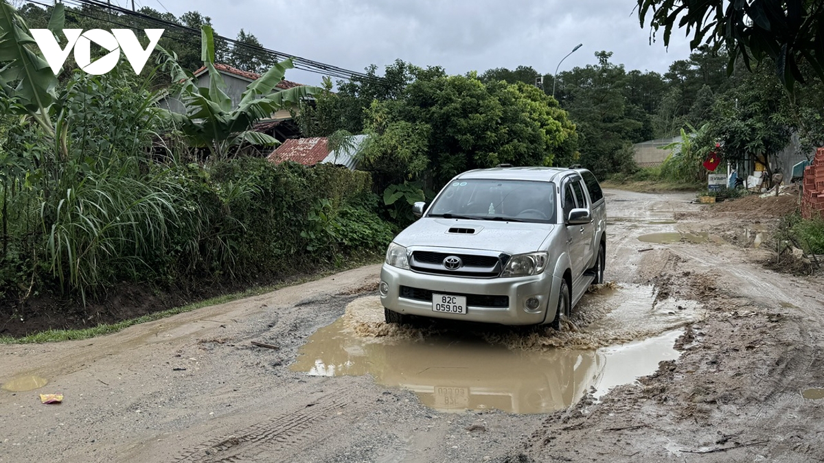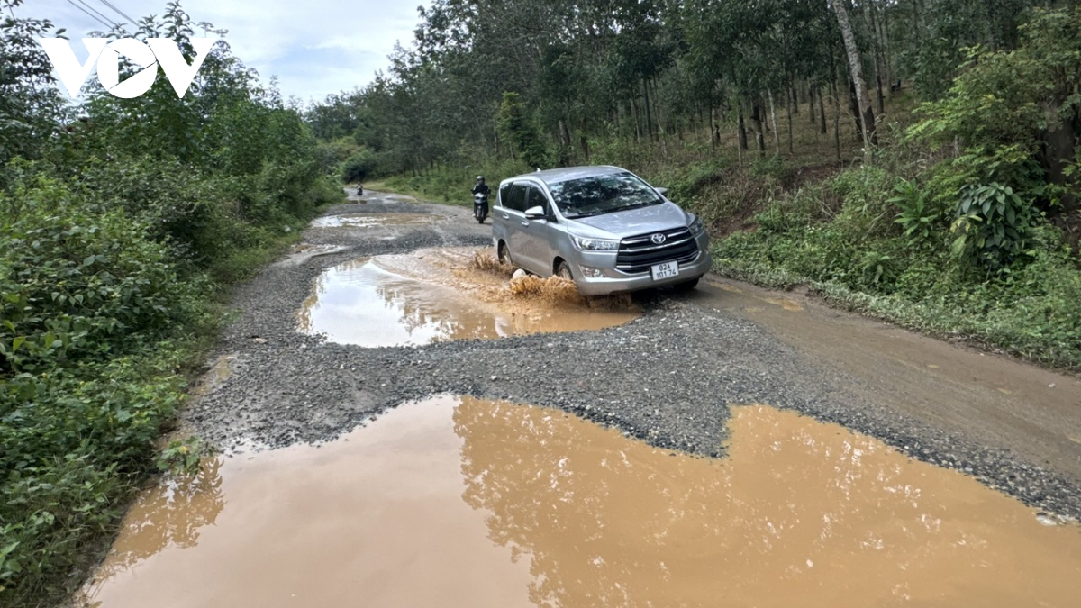 “Đường từ đây đi xã Đăk Nhoong và biên giới hư hỏng miết, toàn ổ voi, ổ gà, đoạn trên kia còn hư hỏng nặng hơn dưới đây. Mới mưa sáng nay mà nước đọng nhiều lắm, lầy lội, đi lại rất khó khăn. Người dân đi xe máy chở con em đi học bị té ngã suốt; các xe tải thu mua mì, bời lời, rất khó khăn trong việc di chuyển”- ông A Nghị nói.