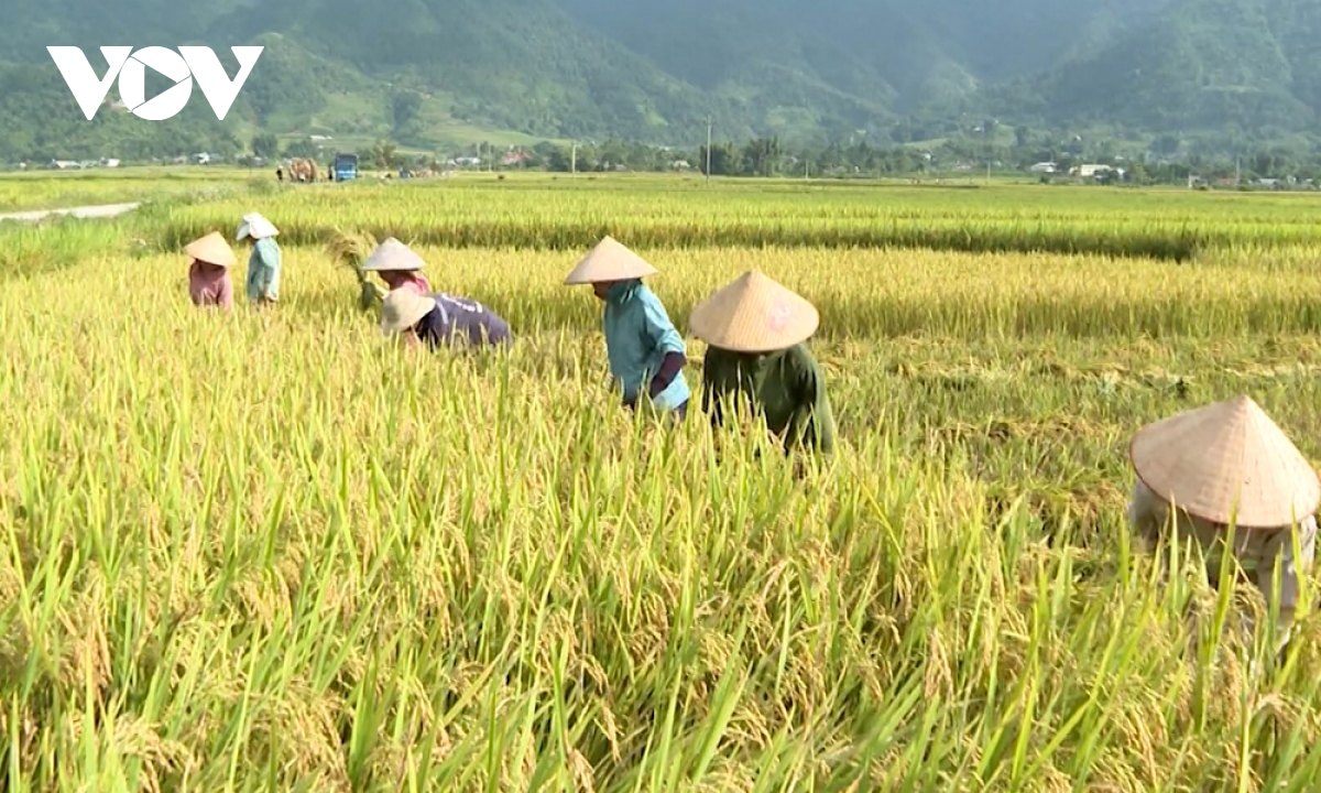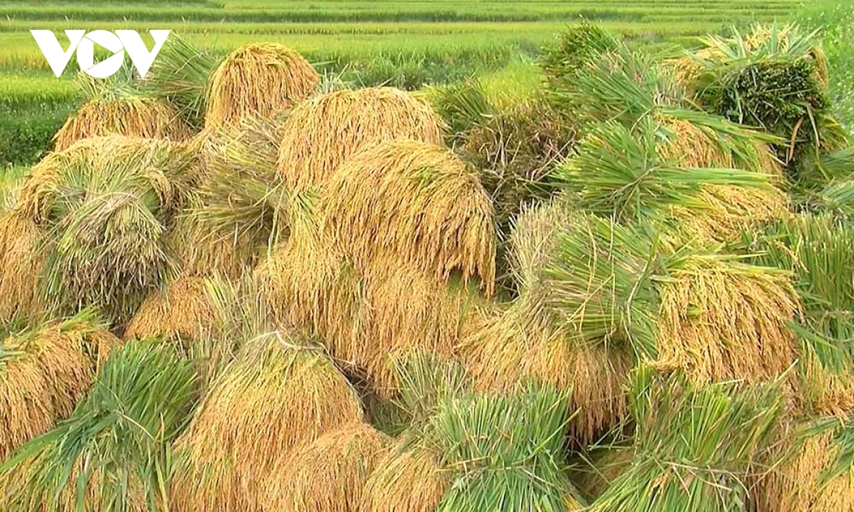 Sau thu hoạch, lúa sẽ được phơi hong 1 nắng tại chân ruộng trước khi thu gom vận chuyển mang đi tuốt