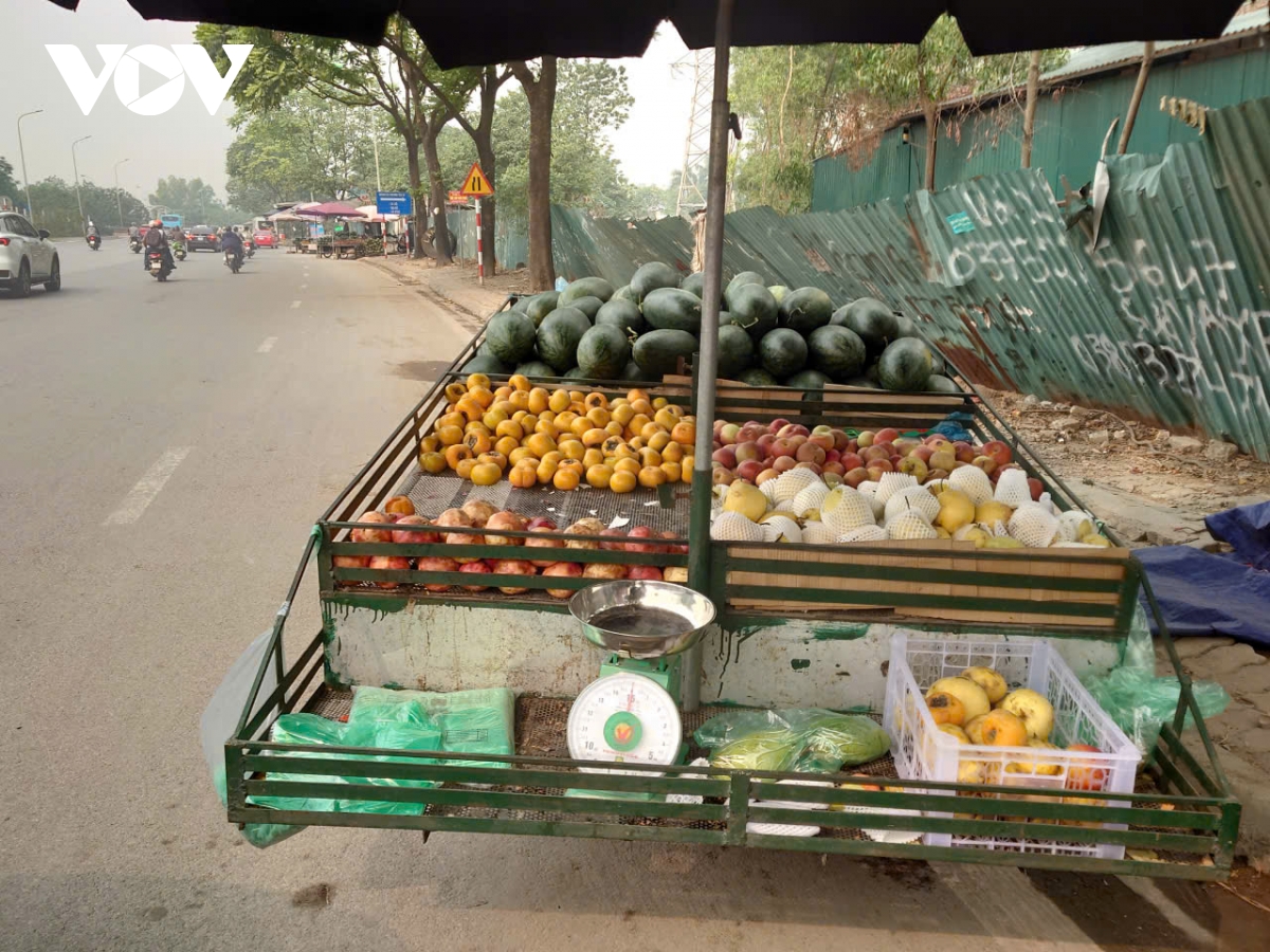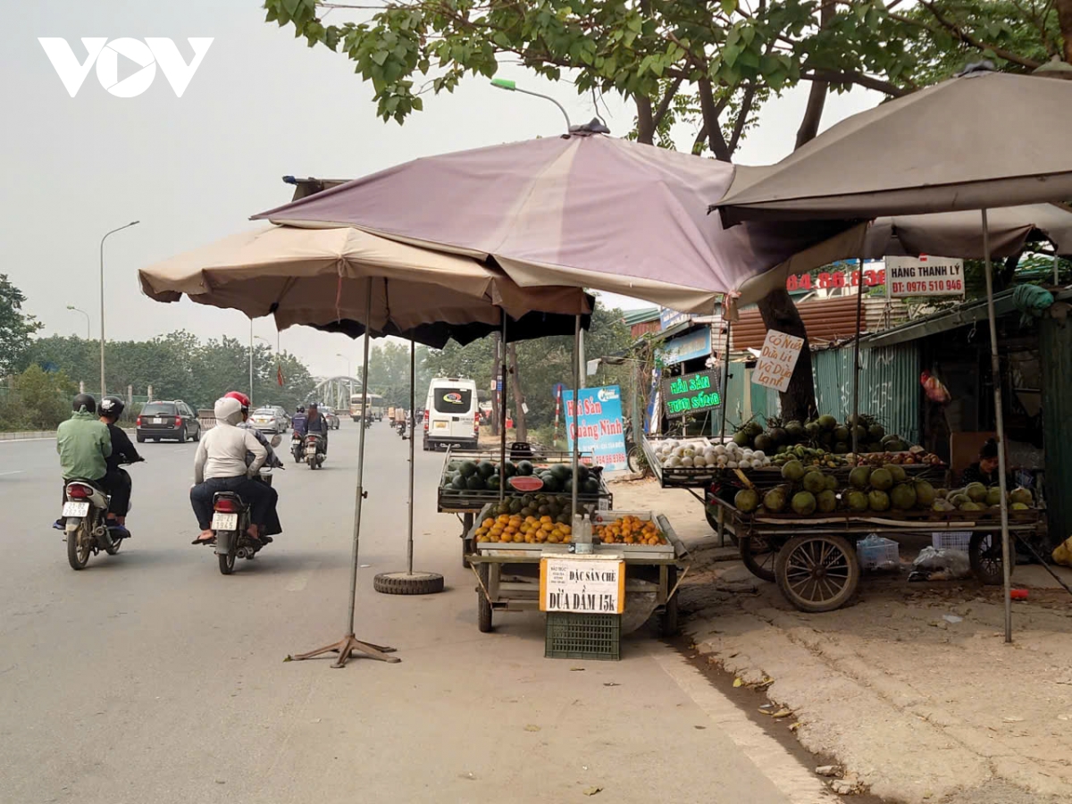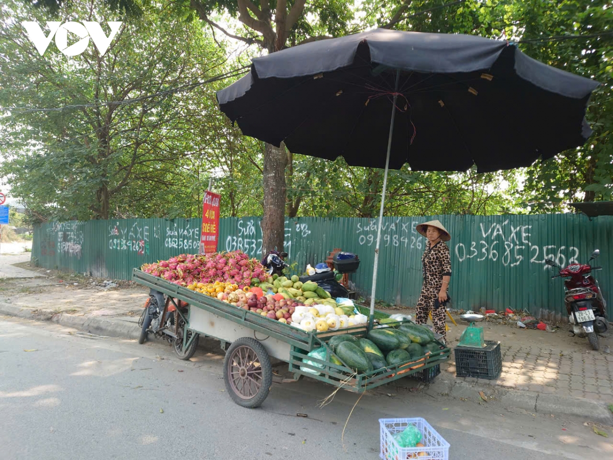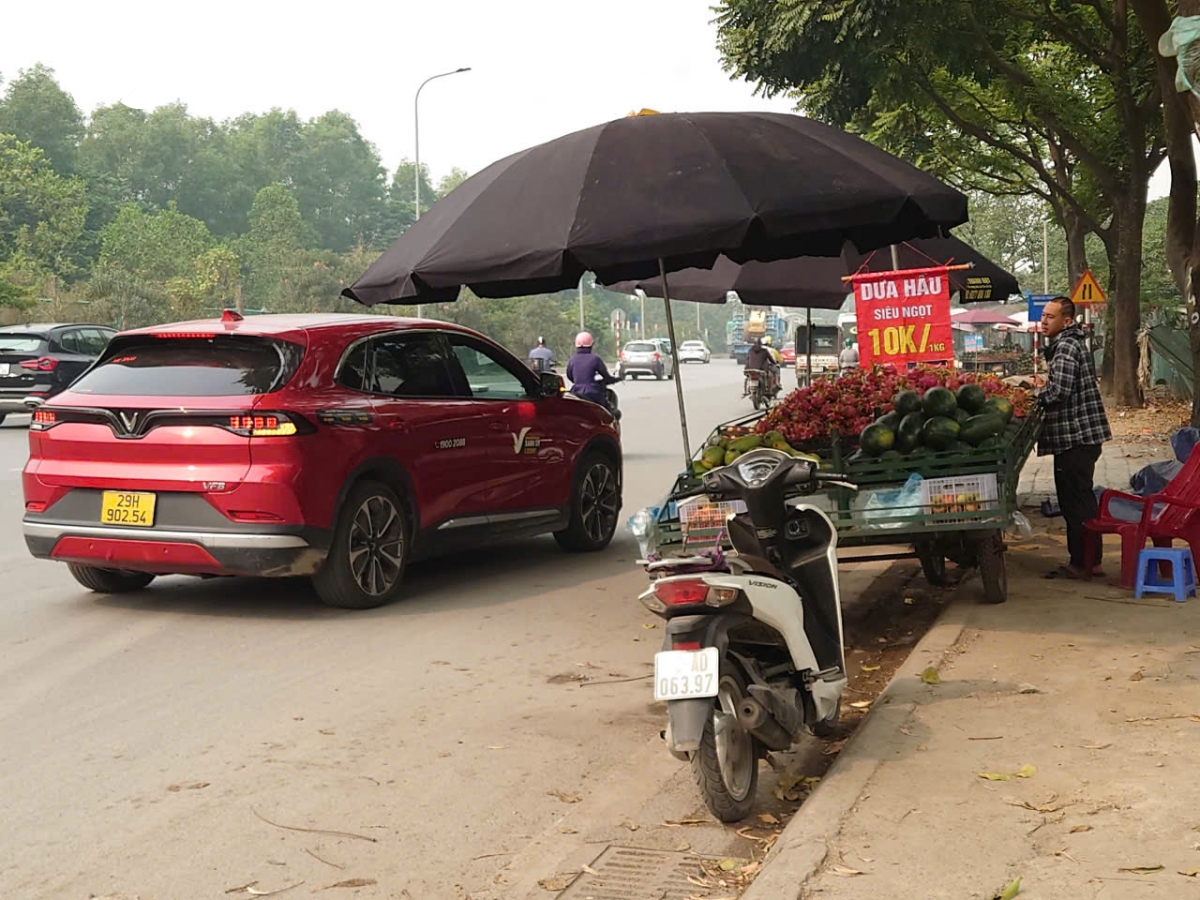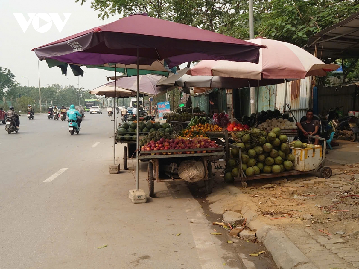 Trên đường gom Đại lộ Thăng Long, đoạn qua địa bàn quận Nam Từ Liêm (Hà Nội), thường xuyên diễn ra tình trạng người dân bày bán hàng hóa tràn lan từ vỉa hè xuống lòng đường. Dọc tuyến đường, không khó để bắt gặp hình ảnh những xe bán hoa quả lưu động ngay dưới lòng đường như thế này.