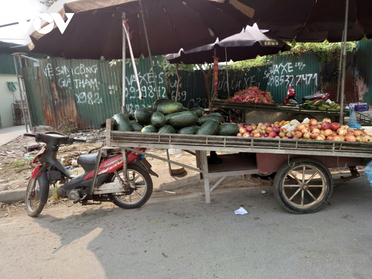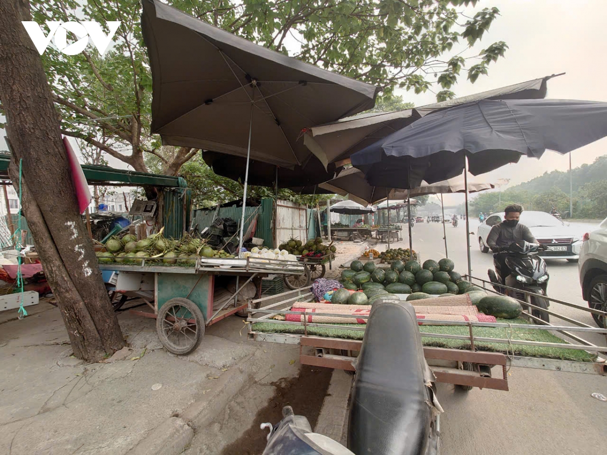 Hoạt động mua bán này diễn ra từ sáng đến chiều tối hàng ngày, ô dù, sạp hoa quả lấn cả xuống phần đường của người tham gia giao thông.