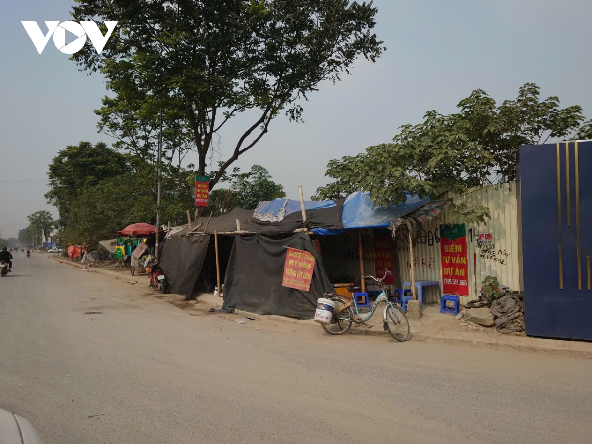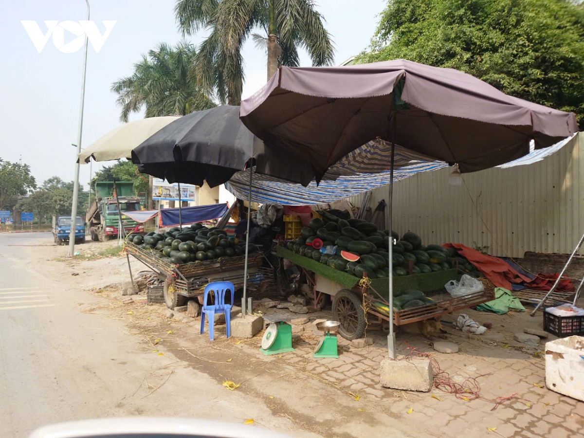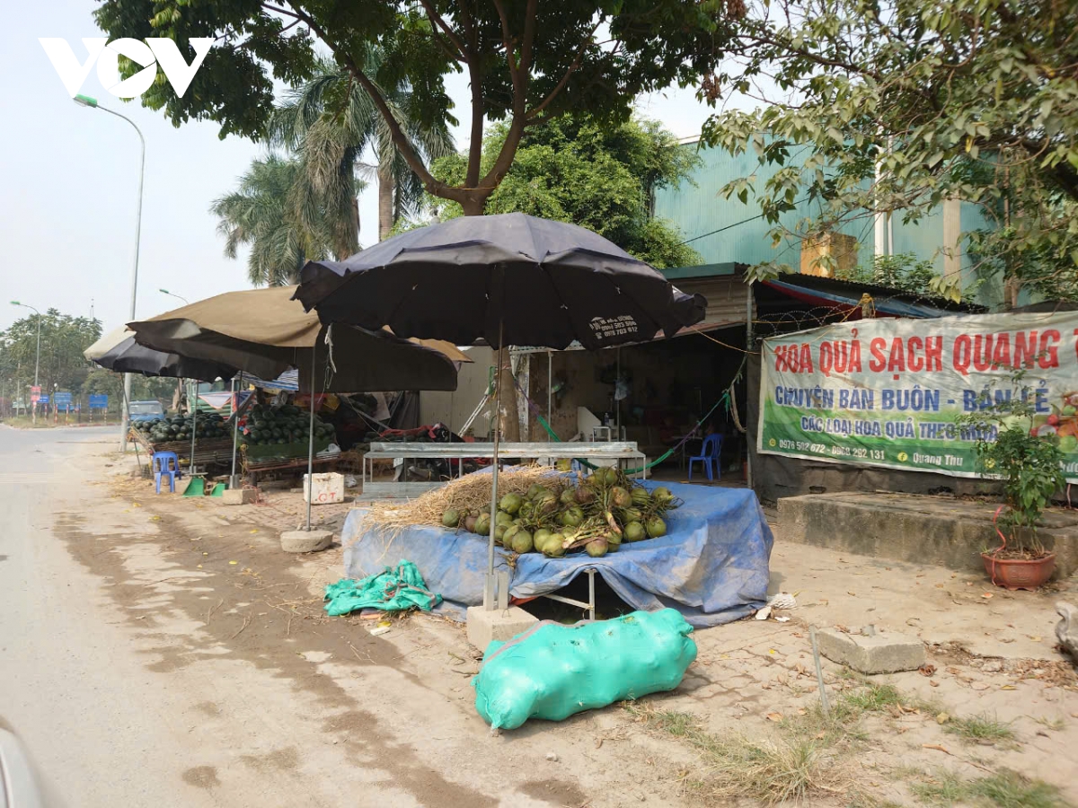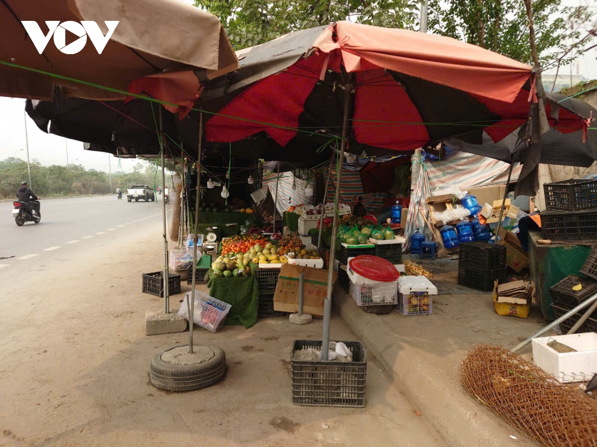Các quấy hàng tự phát bày bán đủ mặt hàng, như đồ nông sản, hoa quả, bánh mỳ, mũ bảo hiểm…. Có nhiều hộ căng bạt, dựng lều trông như những ki-ốt bán hàng.