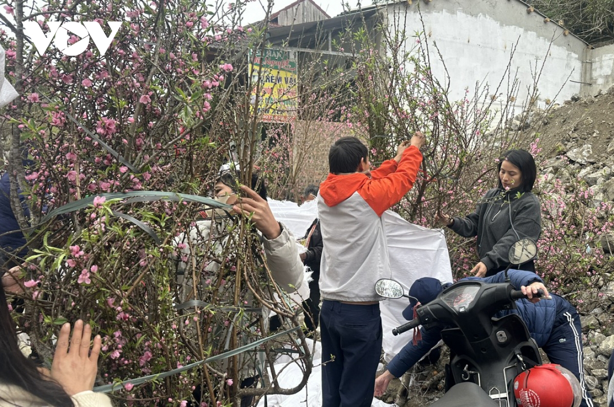 Người dân và du khách chọn hoa đào, hoa mận Bắc Hà về chơi Tết.