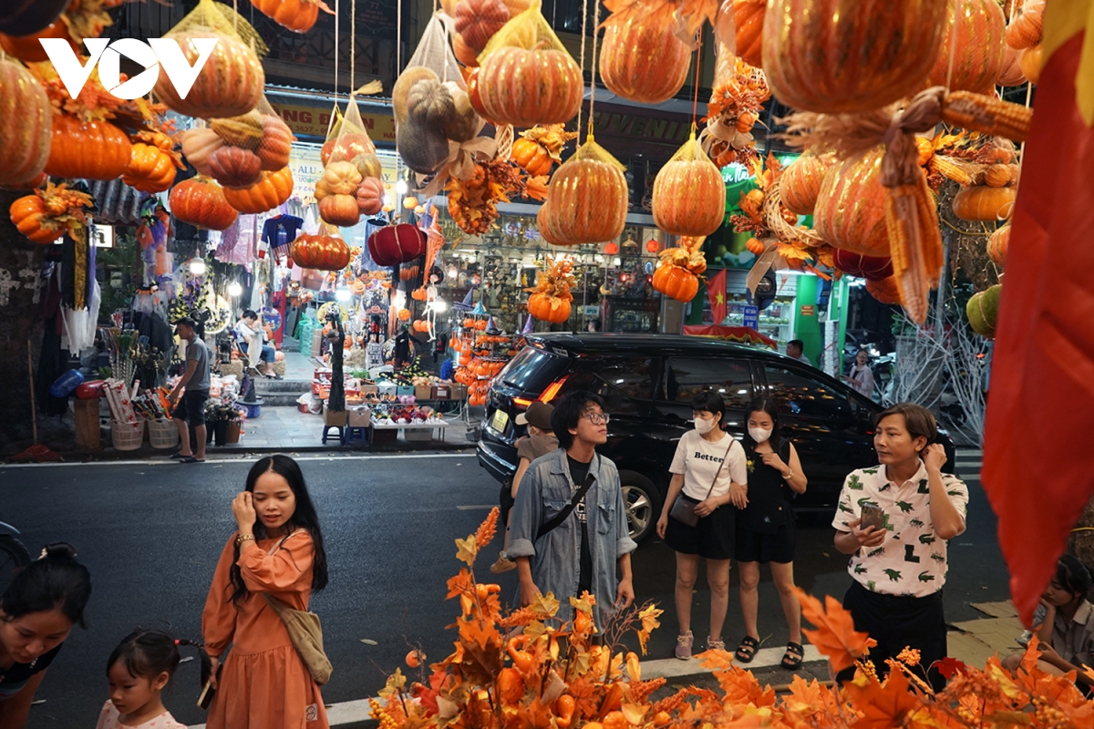 Nhiều người thích thú trước sự bày trí đẹp đẽ, đứng chụp ảnh ở trong và ngoài không gian của các cửa hàng bán đồ Halloween dọc con phố.